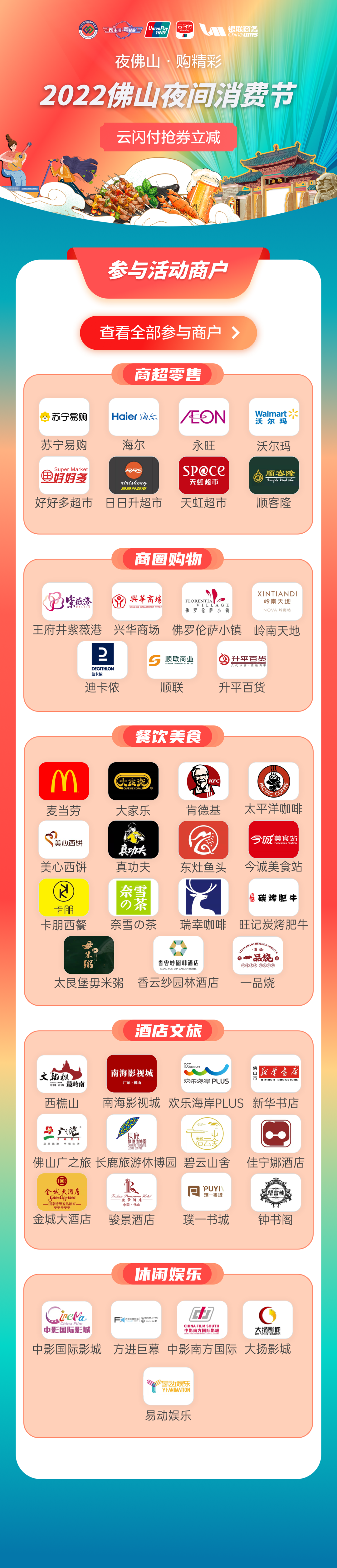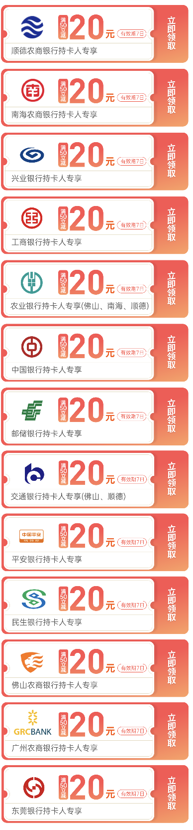 定位至佛山市,即可领取指定银行“满50元减20元”专属优惠券,领券后前往指定活动商户消费,通过云闪付APP绑定指定