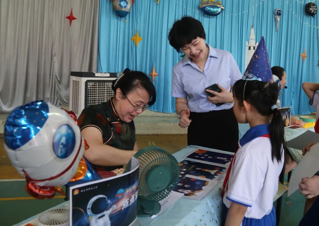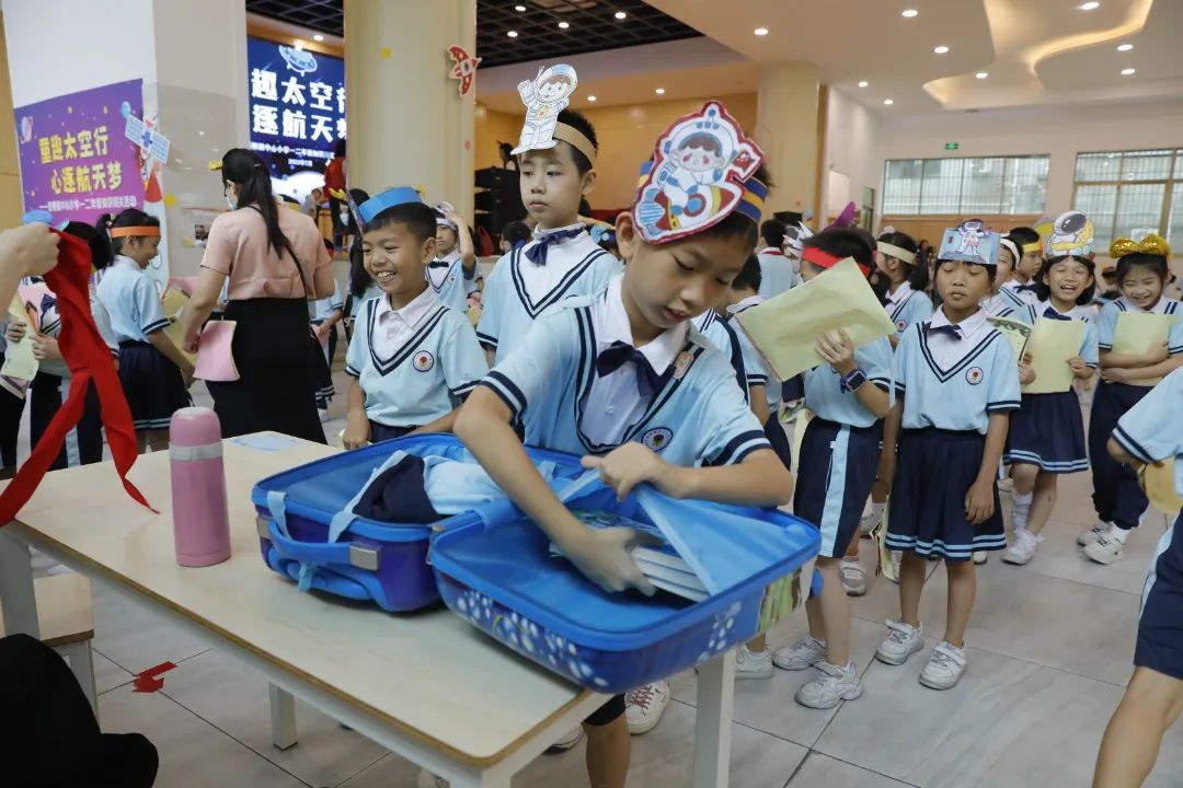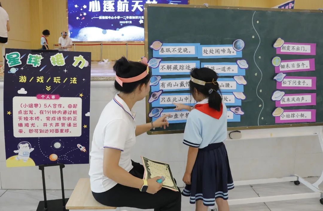 在南海区西樵镇中心小学,一二年级的孩子也正在进行一场“逐梦航天”的知识闯关主题活动:在1分钟内通过航天独木桥,完成诗句的正确接龙,并大声背诵出来,即可到达对面星球;挑选自己喜欢的神舟飞船,根据飞船上的主题进行口述作文......