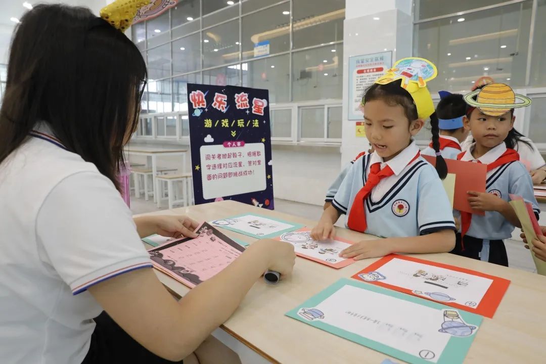 在闯关活动中,佛山市第九小学设置了12个测评项目,主题都与太空相关。孩子们化身航天员,点亮知识星空。其中包括语文素养类的聆听天籁、妙语连珠等环节,考察拼音、字、词、课文背诵、口语交际、阅读理解等内容;数学素养类的偷天换日、斗转星移考察计算能力、解决问题、生活应用等内容;英语素养类的星海畅游、星空对话考察英语单词、英语歌曲、口语交流等内容。