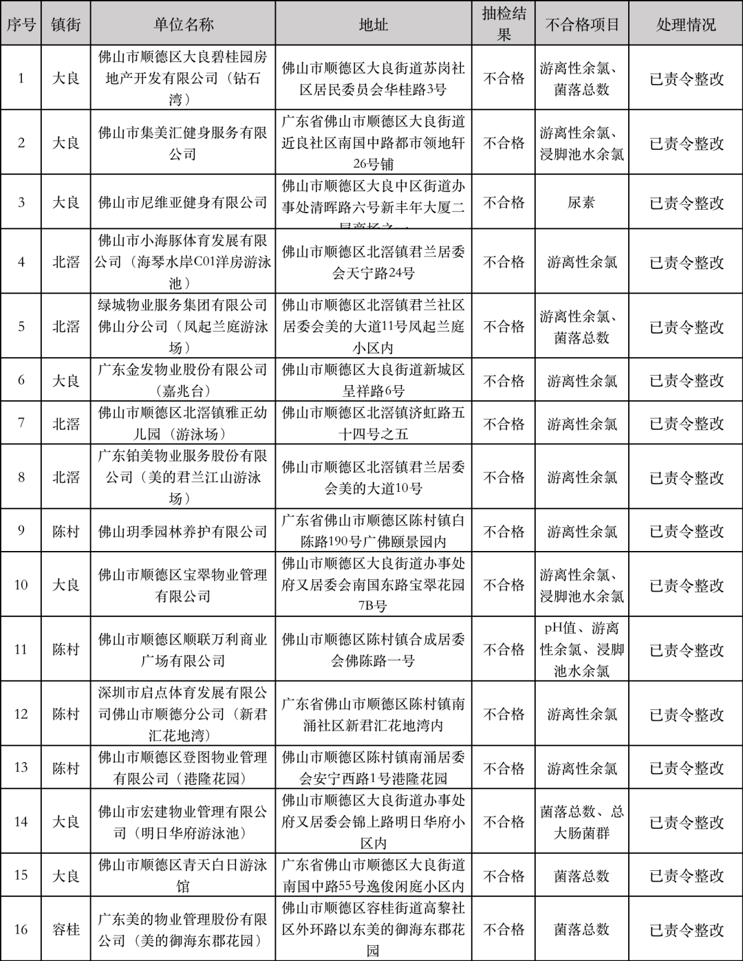 2022年顺德区第一批泳池水池抽检不合格单位