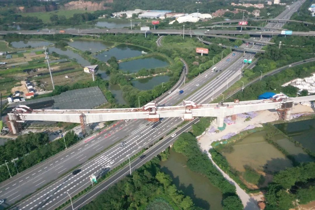 8月15日,广湛铁路广珠广茂联络线下行线特大桥跨广三高速公路和西二环匝道入口连续梁顺利合龙,标志着项目重难点控制性工程再次取得阶段性胜利,为后续架梁、铺轨作业的顺利衔接奠定了坚实基础。