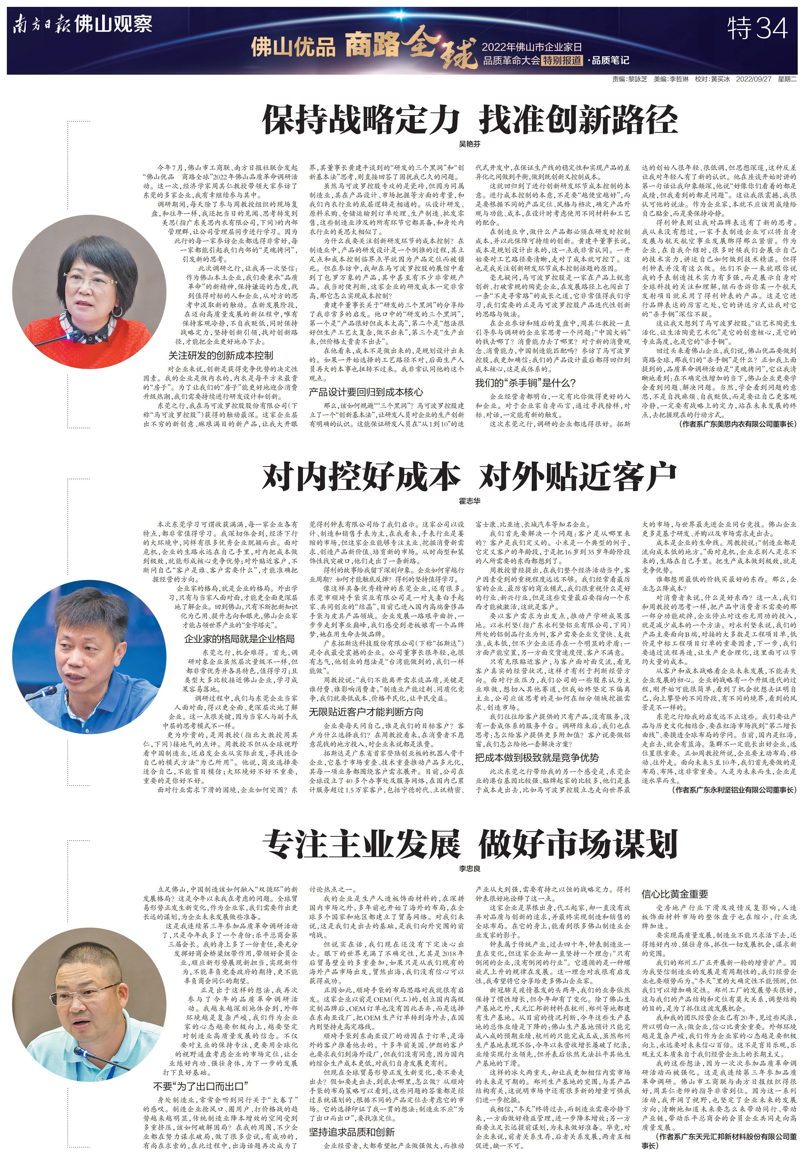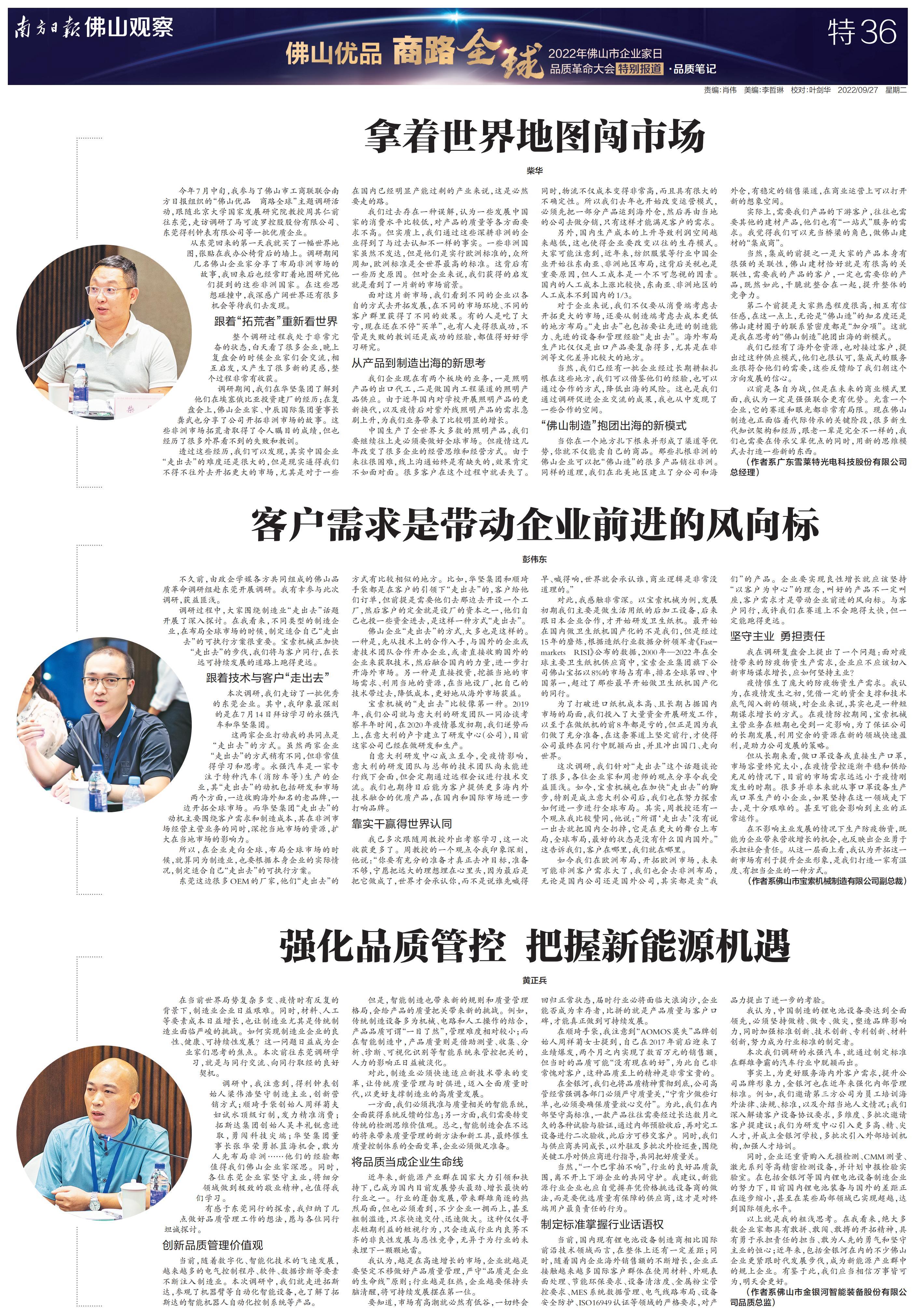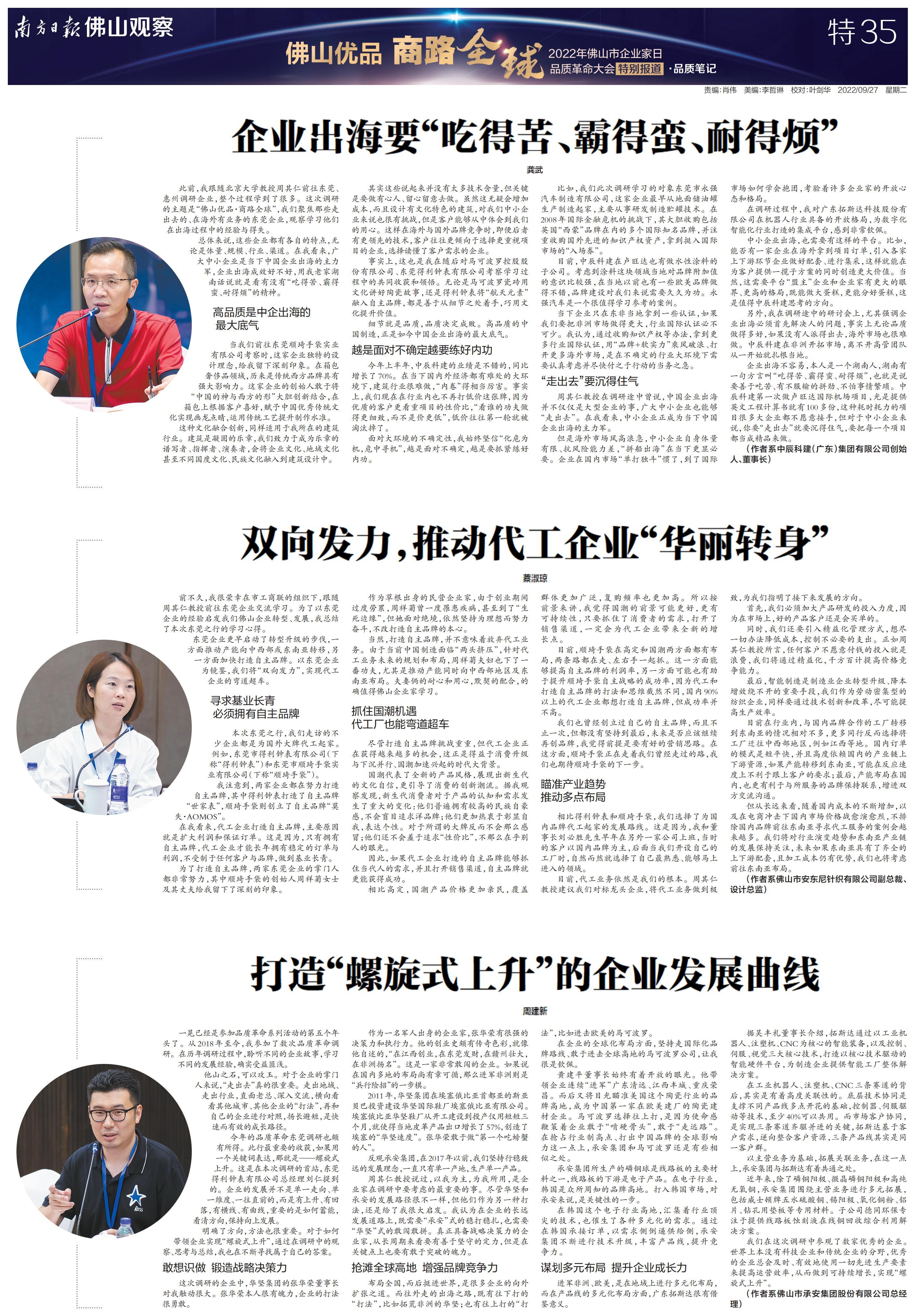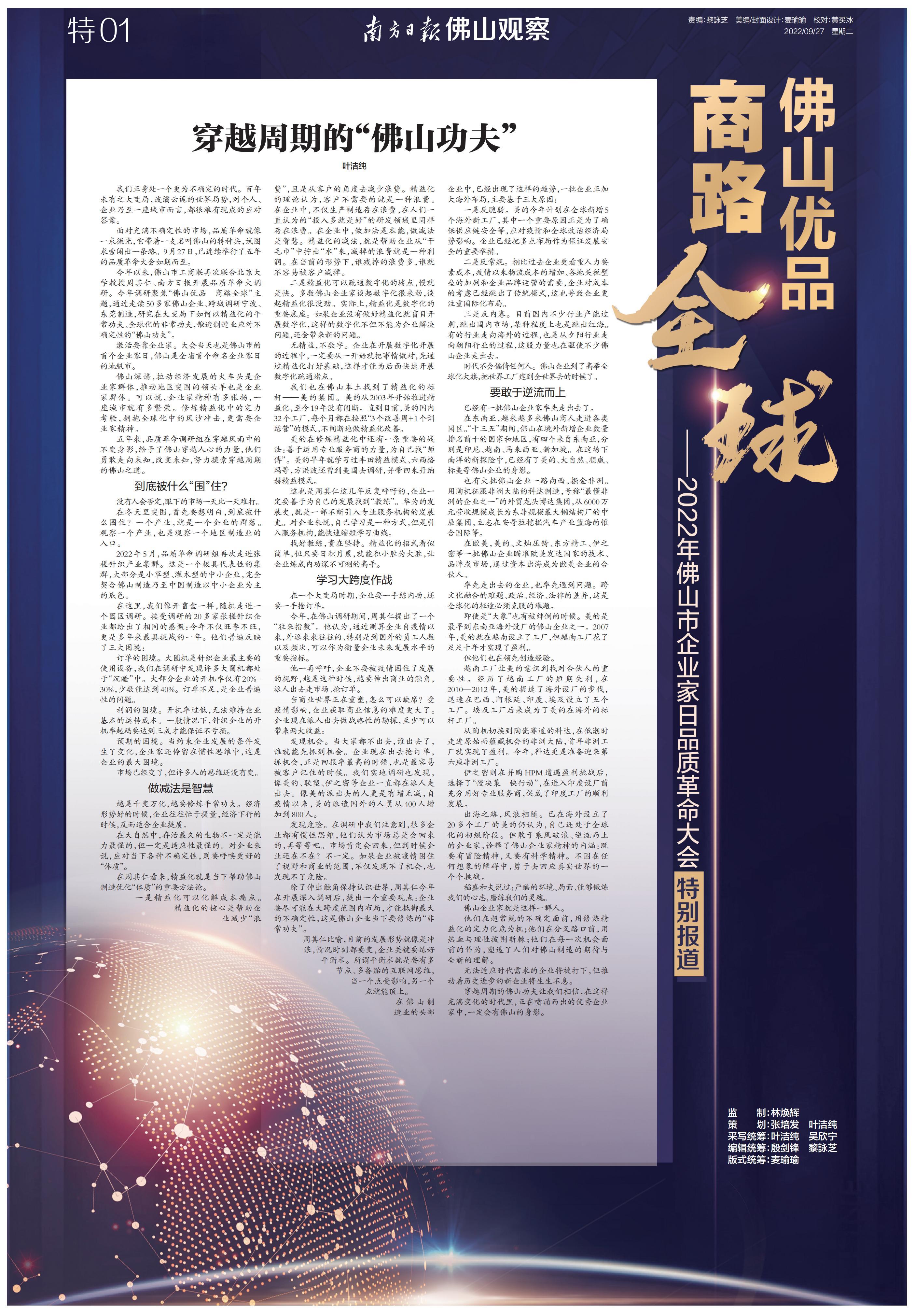 南方日报全程记录,并集结调研成果推出《“佛山优品 商路全球”2022年佛山市企业家日品质革命大会特别报道》特刊,立足佛山,为中国制造融入“双循环”新发展格局探索有效路径。以下为本次特刊全部36个版的报道。