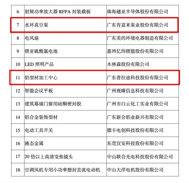 其中,万和电气上榜产品为家用燃气热水器,银洋环保新材料上榜产品为水性树脂乳液,肯富来泵业上榜产品为水环真空泵,普拉迪科技上榜产品为铝型材加工中心。
