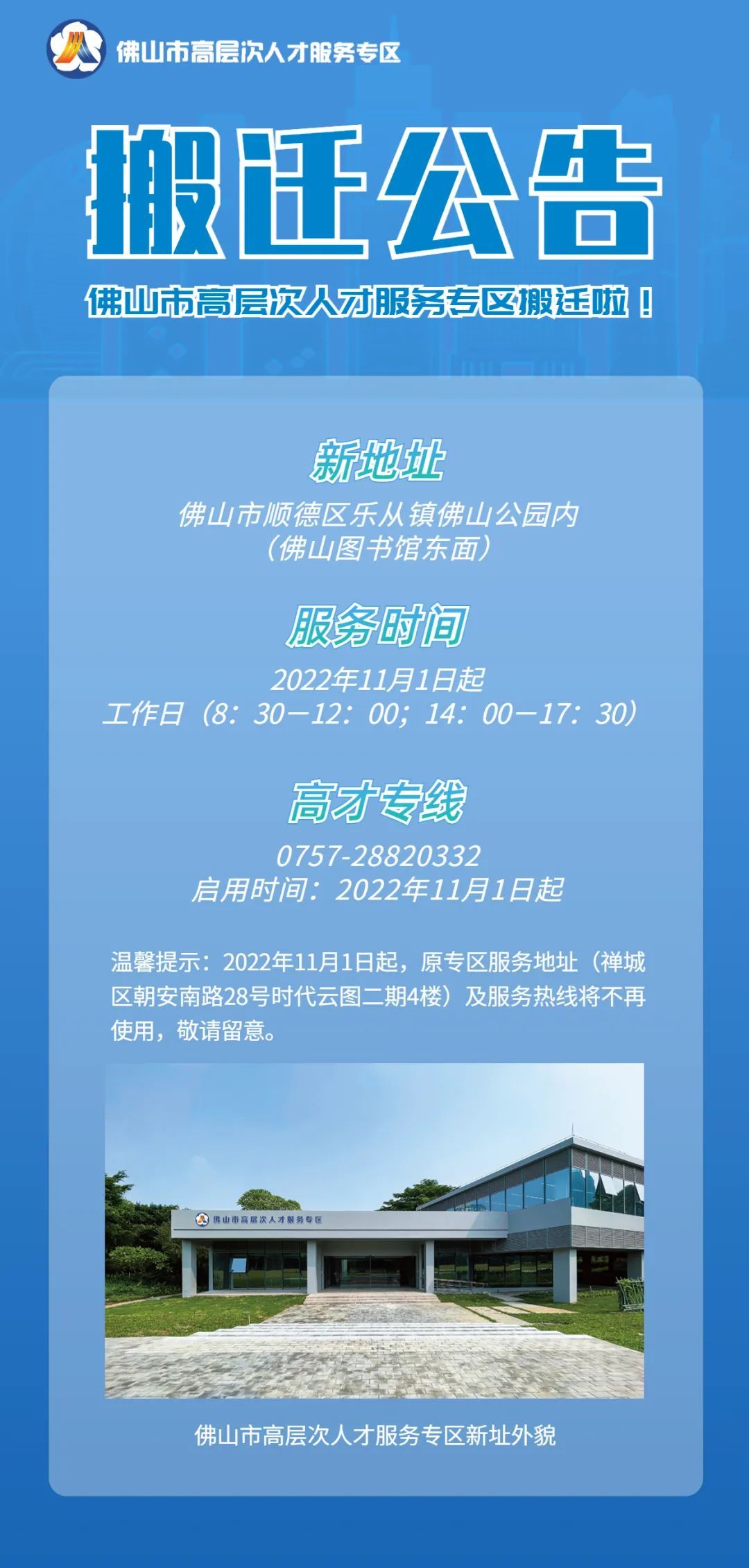 为建设佛山人才高地,打造一流的佛山人才服务体系,佛山市高层次人才服务专区(以下简称“佛山高才专区”)将从佛山高才专区原办公地址(佛山市禅城区朝安南路28号时代云图1号楼4楼)搬迁至佛山公园内,为佛山市各类高层次人才提供优质高效和便捷舒适“专区式”人才服务平台与空间。
