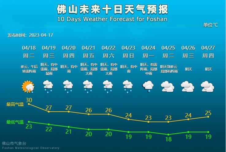 4月15日到17日上午佛山晴间多云,早晚有轻雾,16日全市录得最高气温32.9℃。