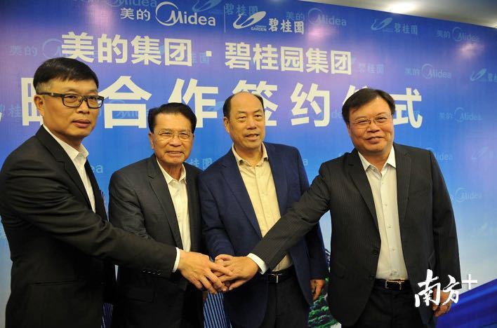 2日,美的与碧桂园战略合作协议签约现场,当美的集团创始人何享健、美的集团董事长方洪波、碧桂园集团创始人、董事局主席杨国强、碧桂园集团总裁莫斌将手紧紧握在一起,所有媒体都将镜头聚焦在这一难得的历史时刻。