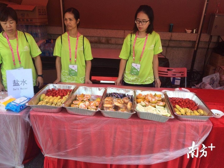 在食物补给方面,组委会安排了丰富的食物、水等补给品,包括西樵大饼、山水豆腐花、三明治、咖啡、肉酱意粉、水煮鸡蛋、鸡汤、火腿通心粉、烧卖、云吞、玉米汤、鱼丸汤、红豆沙、运动饮料、巧克力、水果等,沿途还有志愿者和医疗人员24小时分班站岗保障食物沿途补给。