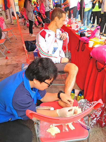 比赛结束后,医护人员为选手做伤口处理。据了解,一天一夜跑下来,很多选手脚上都会磨出水泡。