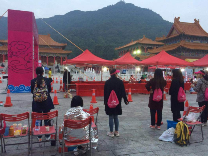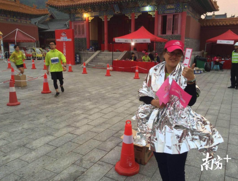 从白天跑到黑夜,从黑夜跑到黎明,辛苦的不仅是选手,还有坚守一夜的志愿者们。由于西樵山下清晨天气寒冷,有的志愿者不得不披上了保暖毯。