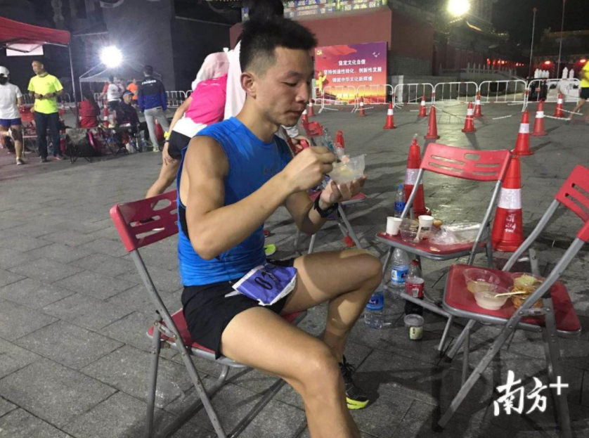 4日下午6时30分,24小时赛选手杨帆已奔跑9个多小时,稍作休息补给食物。