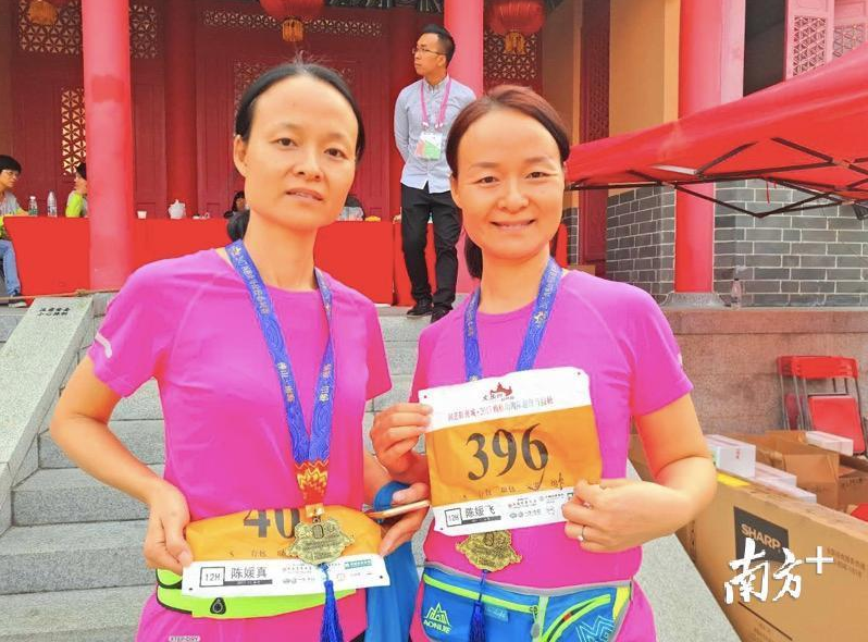 陈媛真、陈媛飞双胞胎姐妹第一次参加12小时赛,双双完成全程,其中妹妹陈媛飞在小腿部受伤的情况下依然坚持跑完。姐妹俩表示她们参赛的原因之一都是为了给孩子树立榜样,这两天孩子都在现场为妈妈加油。跑完12小时是什么体验?“好辛苦好累啊!不过也超级开心,因为毕竟经历了别人没有经历的事。”陈媛飞说。