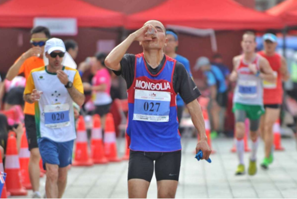 不浪费时间!志愿者们将水倒好,直接送到选手手上,方便他们边跑步边喝水。