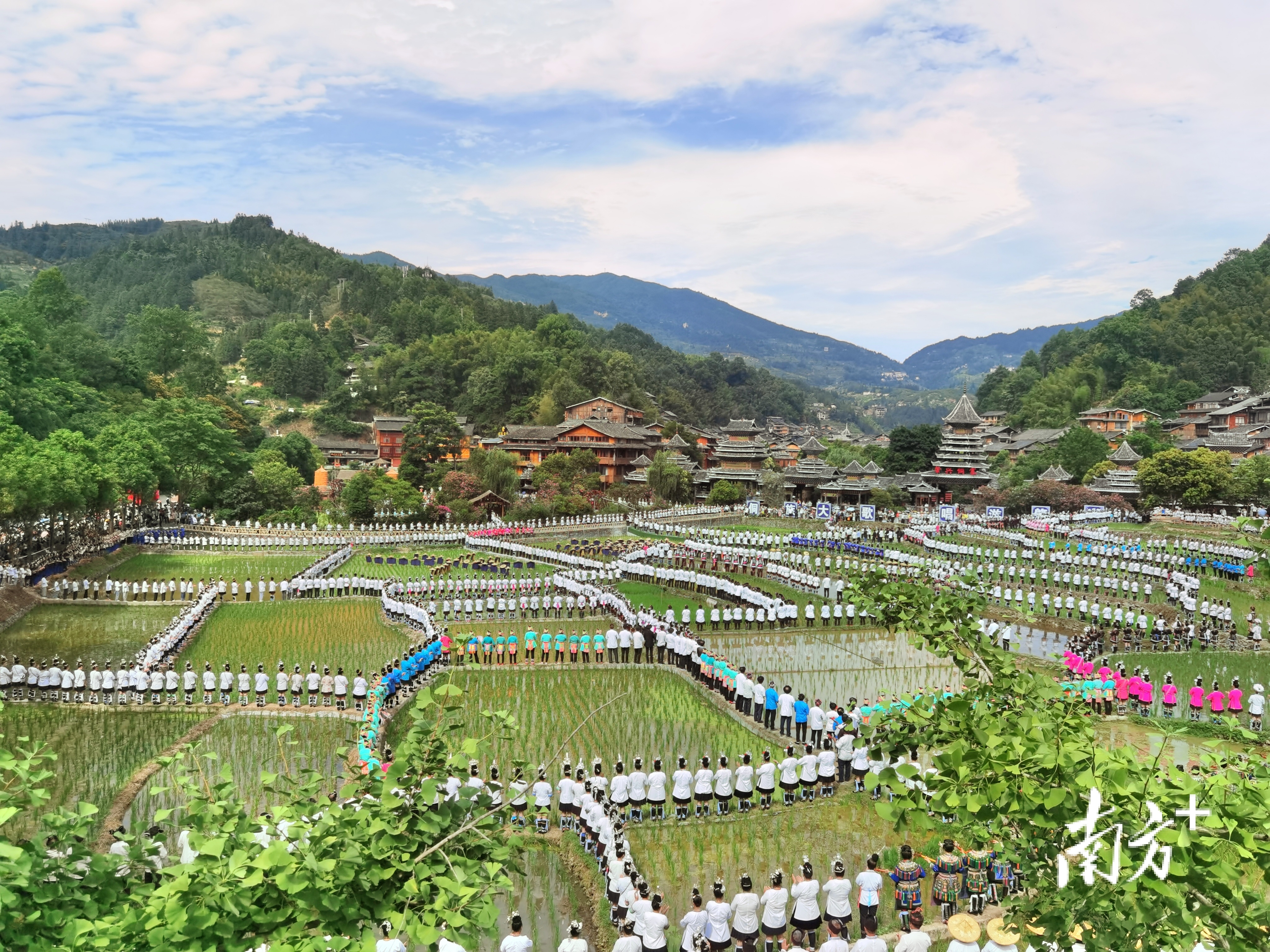 10日当天,肇兴侗寨阵阵歌声响彻群山之间,3021名侗族大歌歌手在田埂间与现场游客、群众近万人合唱歌曲;盛装巡游环节,3000余名侗族群众身着民俗盛装巡游,展示百花齐放的黔东南服饰文化。