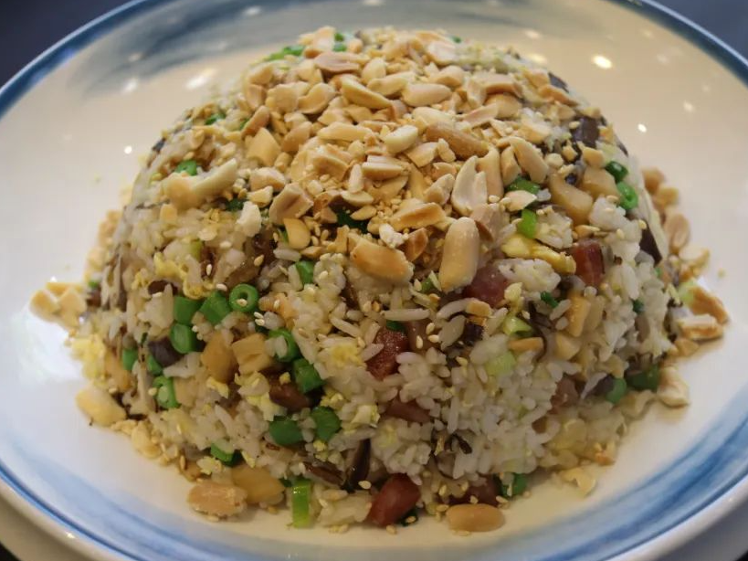 桥珠印象的大厨把豆角、猪肉、鱿鱼、冬菇、虾米、蛋丝等配料,在大火之下与米饭共同翻炒在一起,做成地道美味的顺德龙船饭。