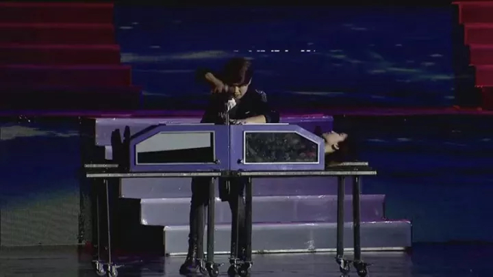 也许你会说三角桶中暗藏机关,所以魔术师助手能够毫发无损地重新走到舞台。但当你亲眼看到躺下的人被分成两部分后,还能够完好无损地重新站起来,透明二人分的表演让你怀疑自己的眼睛。