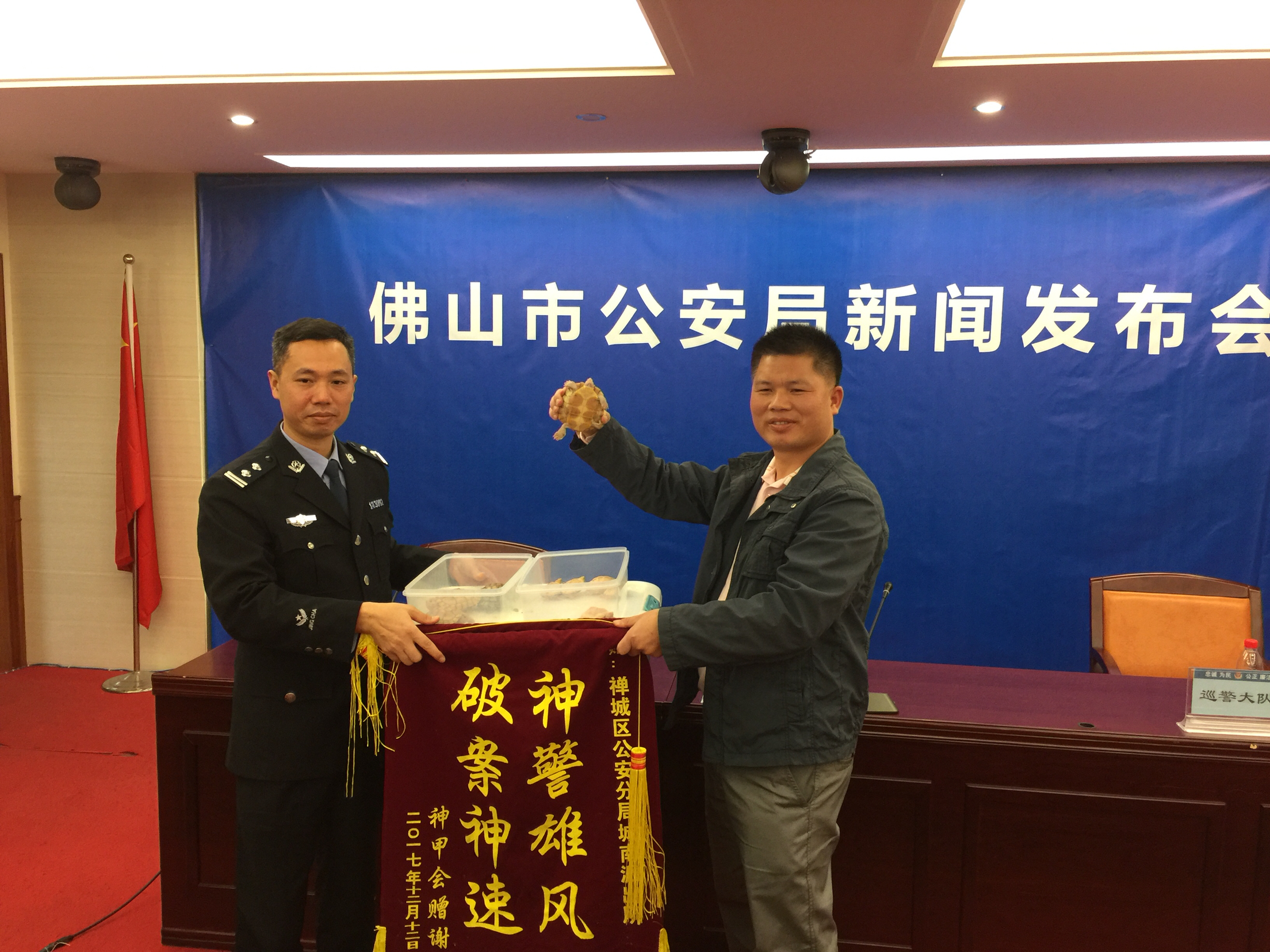 “多谢民警,我们的白化龟又回来了!”当日发布会上,白化龟养殖公司代表廖先生一边抚摸着珍贵的白化龟,一边激动的说道,“真的没有想到,禅城公安这么快就帮我找回那么多只白化龟,不然我们真是损失惨重!”随后,领回被盗宠物龟的廖先生回赠了民警一面写有“神警雄风,破案神速”的锦旗,以感谢民警帮其快速破案挽回损失。