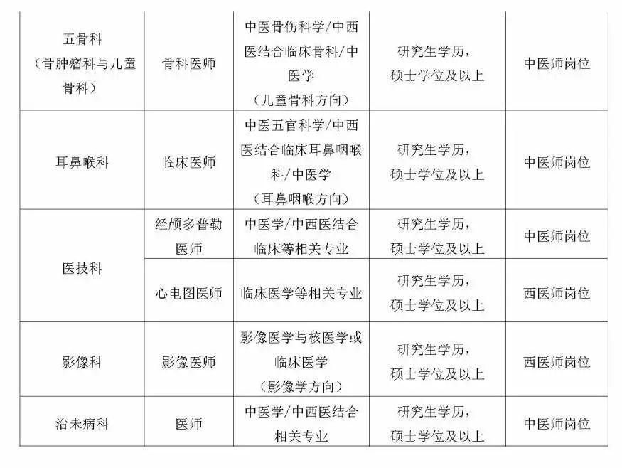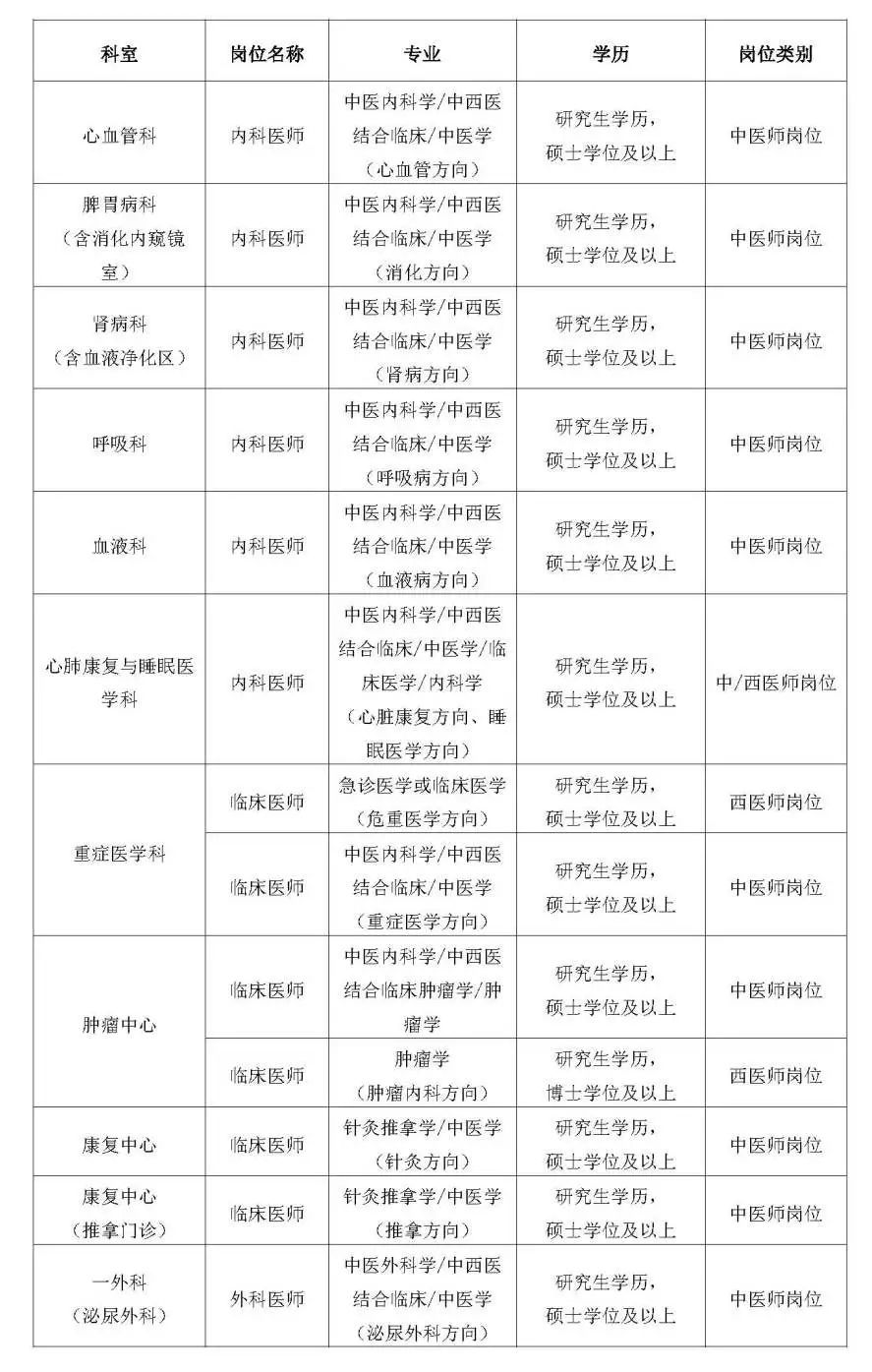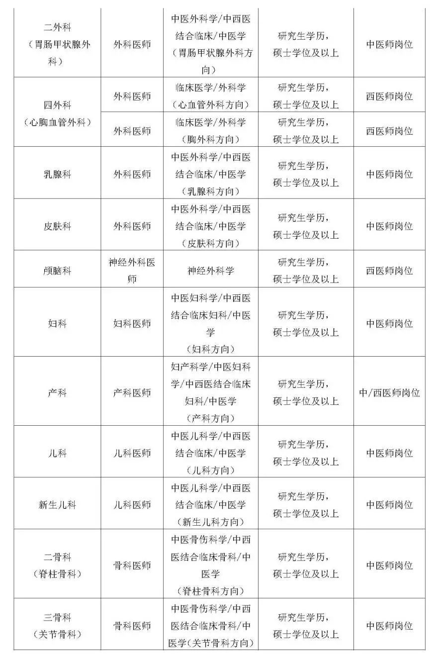 3. 医师岗位需取得执业医师资格证书,其中应聘中医师岗位原则上须经过中医专科医师规范化培训或取得中级及以上专业技术资格证;应聘西医师岗位的应届硕士研究生需取得专业型学位。