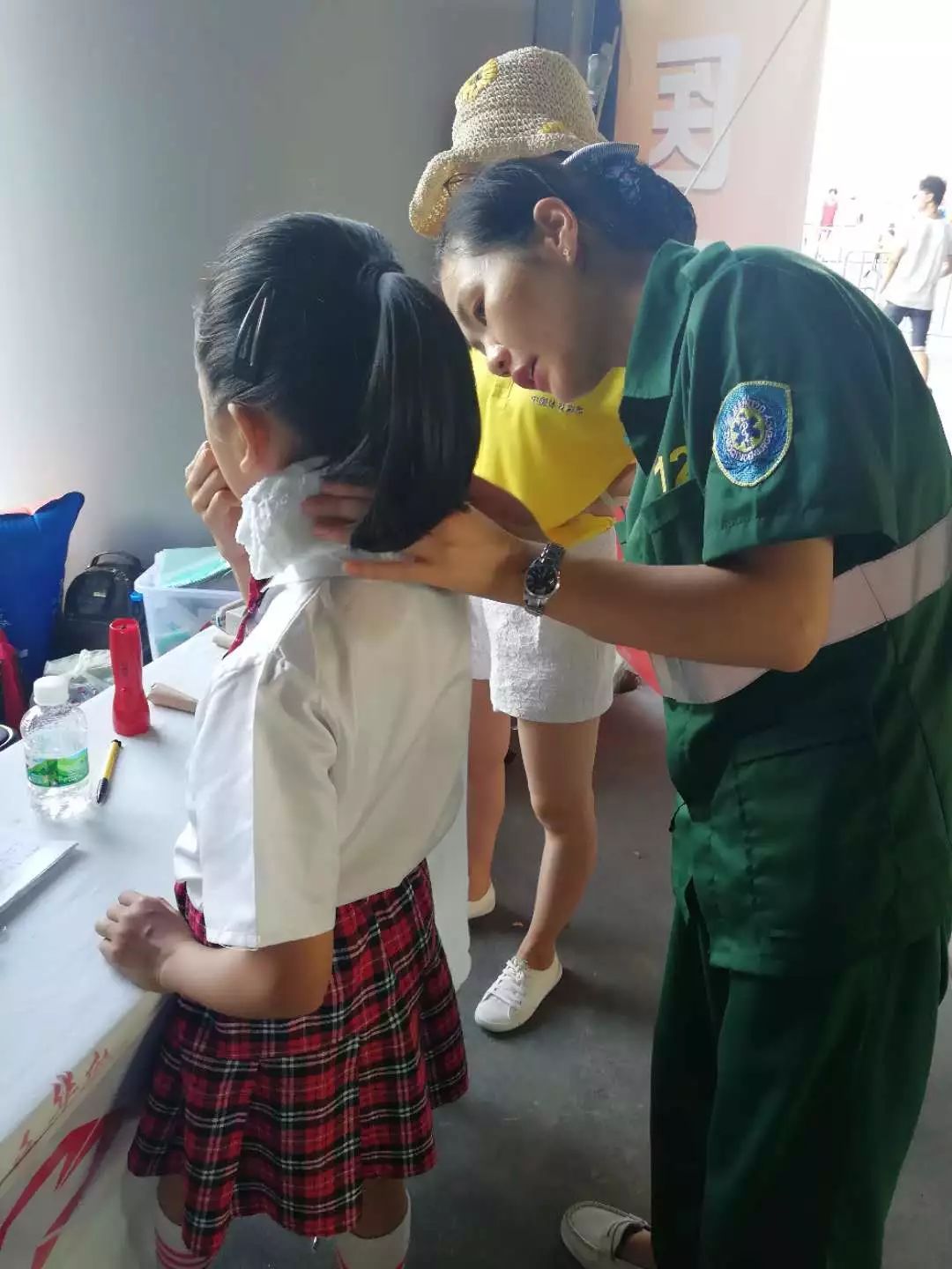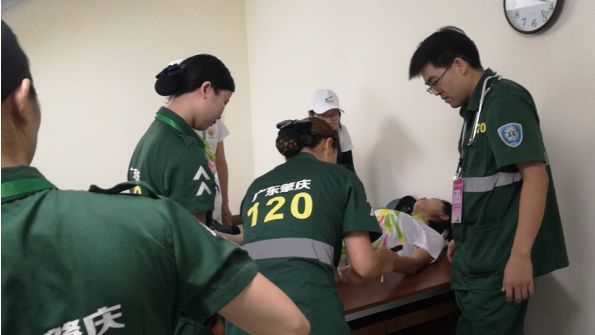 ▲医护人员为省运会开幕式演职人员进行医疗救助