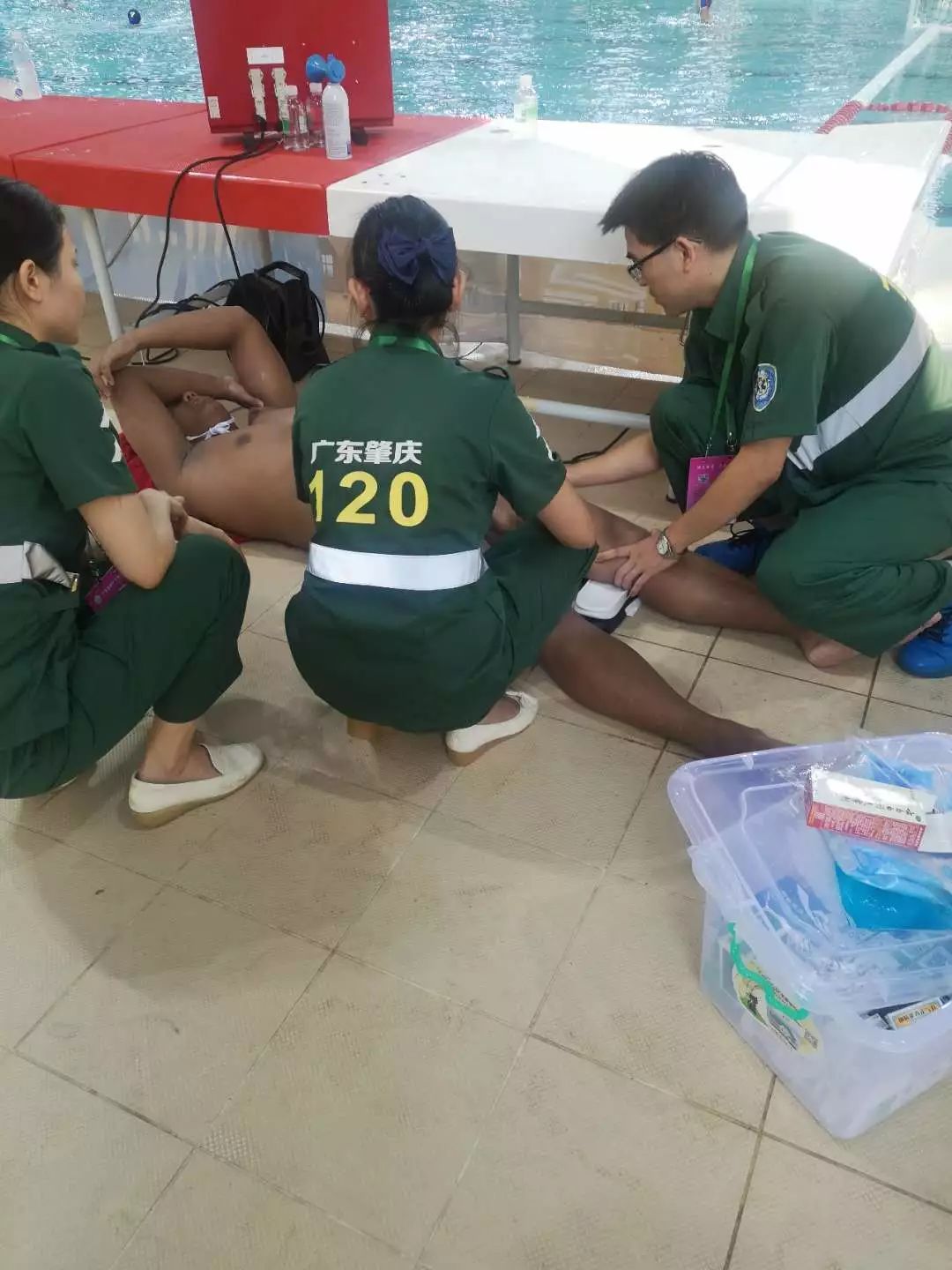 在一次水球比赛中,一名主力队员因体力消耗过大,用力勇猛,又整场没有休息轮换过一秒钟,在水下抽筋了。医护人员听到教练的呼叫后,立马来到了运动员身边,初步了解情况后,马上给予对症处理,放松受伤痉挛肌群,并发挥内外科结合的优势,给运动员充分的按摩放松,药物外用辅助处理。