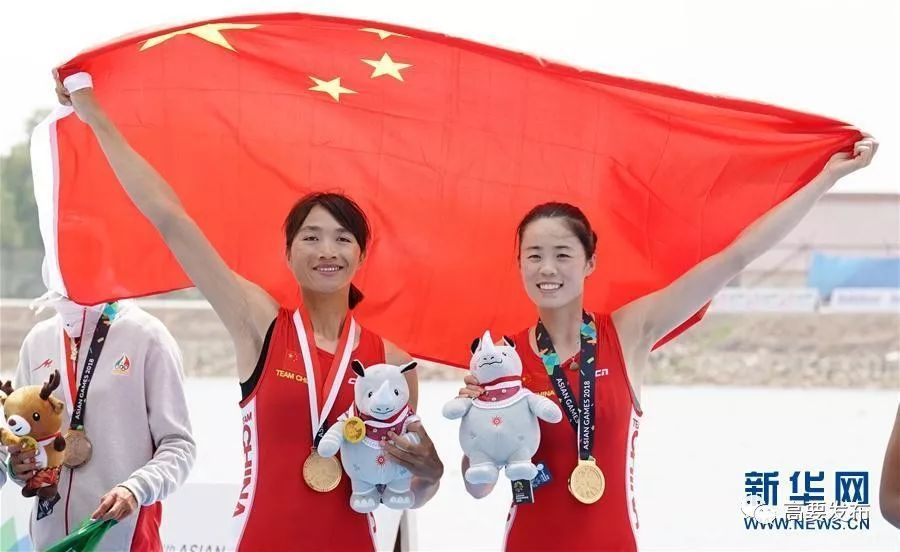 ▲ 中国选手梁国汝(左)、吴强在亚运会颁奖仪式上。 新华社记者 程敏 摄