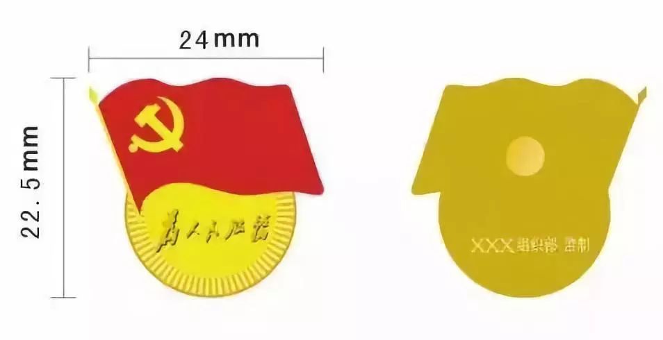 正面上方为中国共产党党旗图案,下方为圆形图案,印有“为人民服务”字样; 背面标注××省(区、市)或××部门(系统)党委组织部监制字样。徽章尺寸为24mm×22.5mm×2mm,材质为锌挂镀仿金。