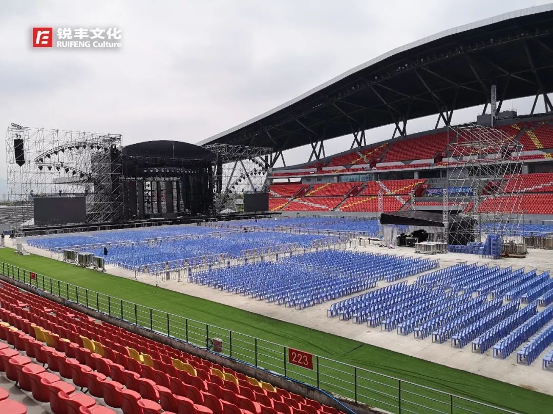 还在新区体育中心搭建的舞台中进行彩排