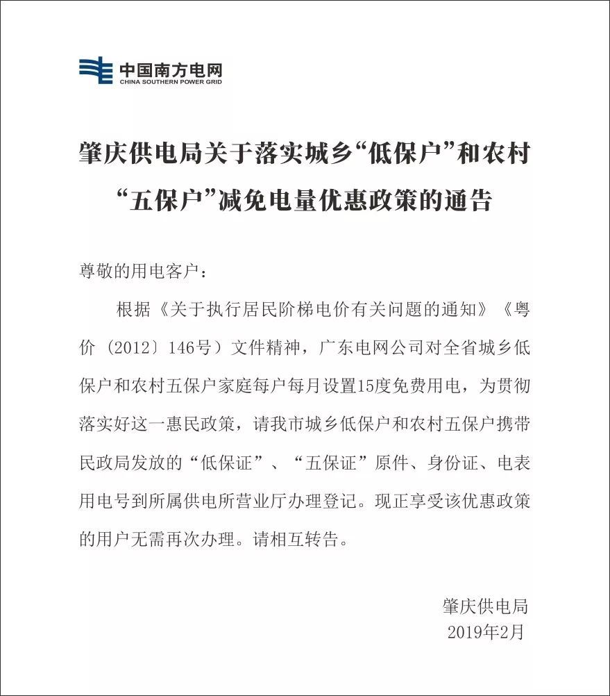 请“低保户”和“五保户”记得带齐以上相关资料到所属供电营业厅办理免费电申请。