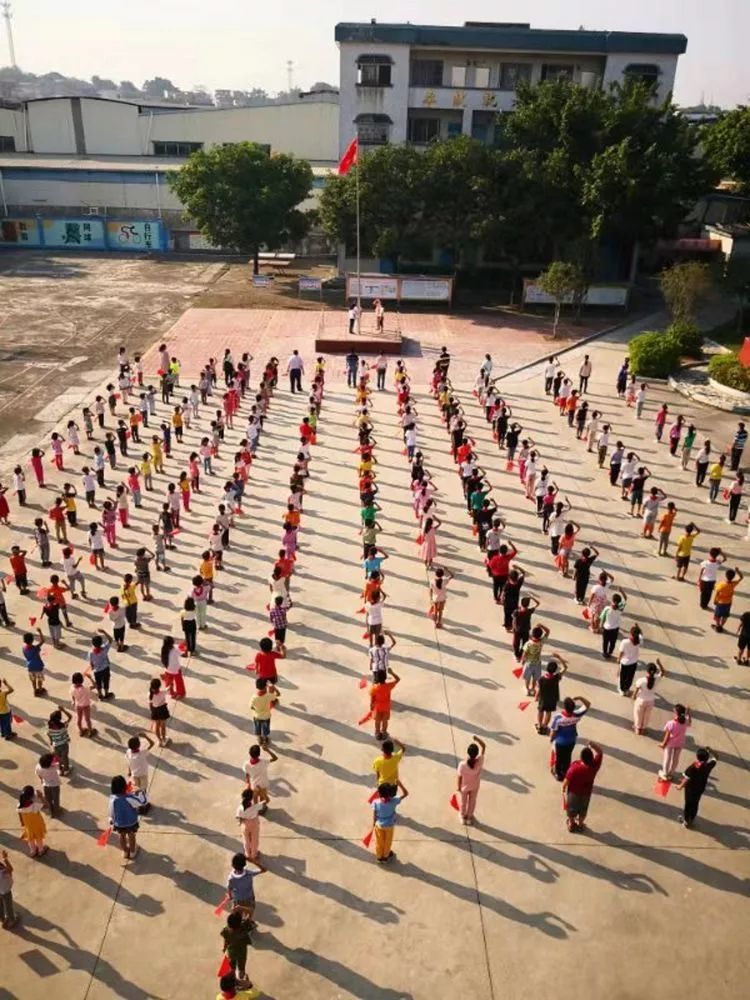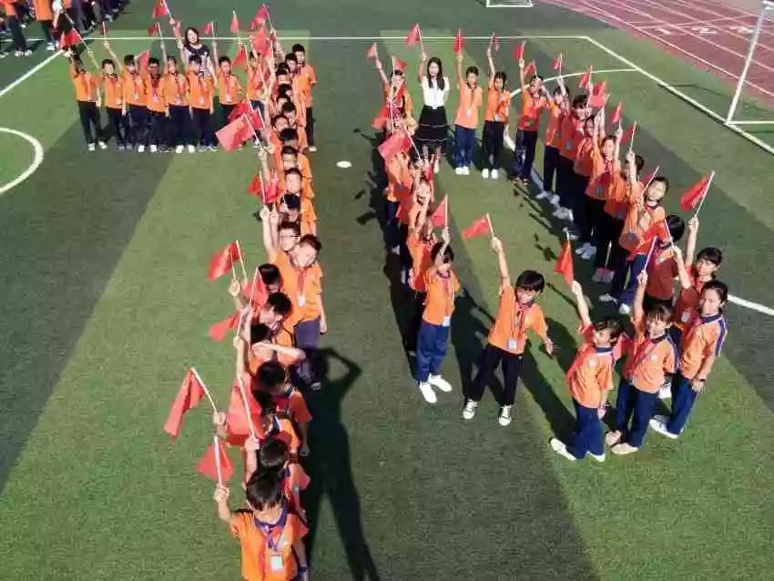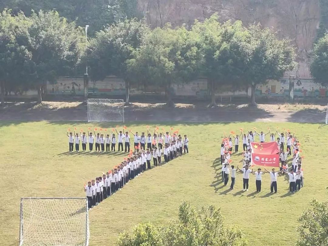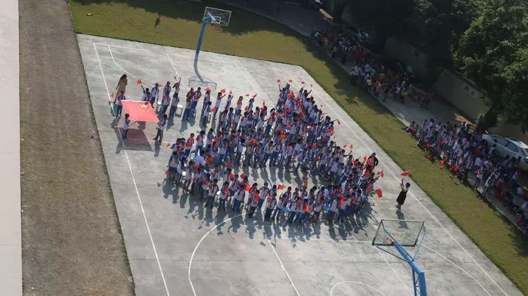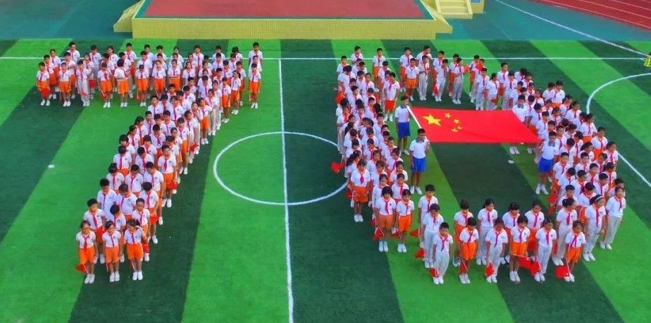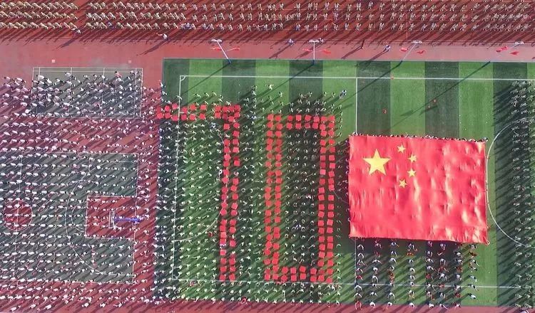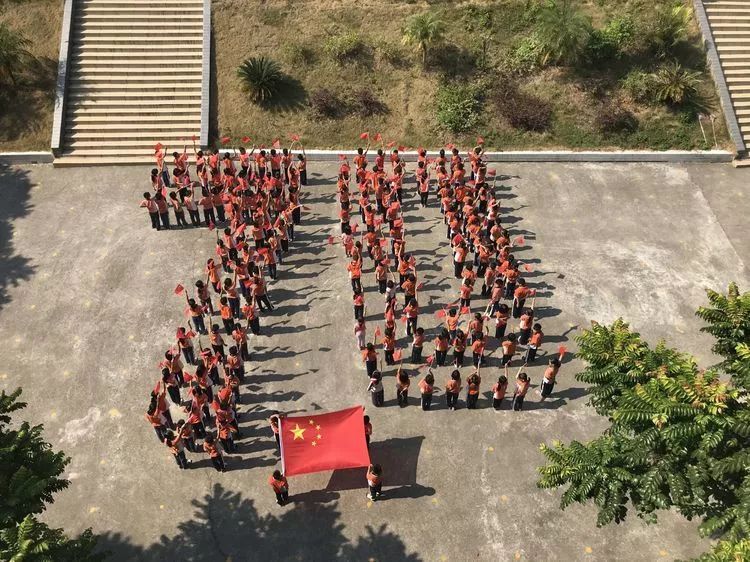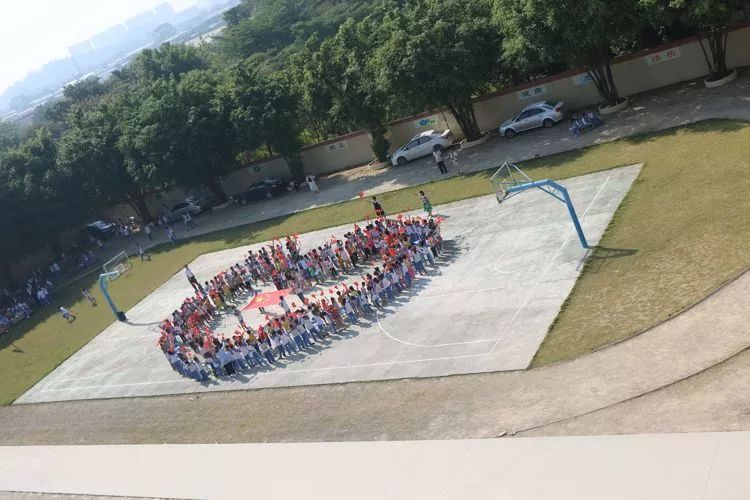 为庆祝中华人民共和国成立70周年,向祖国献礼,四会市各学校师生特意拼出“70”及爱心等造型与国旗合影。
