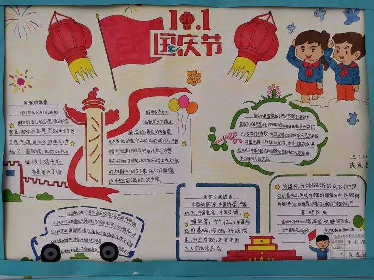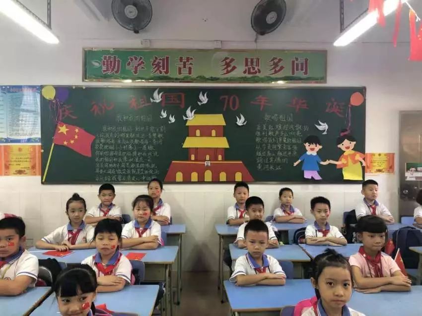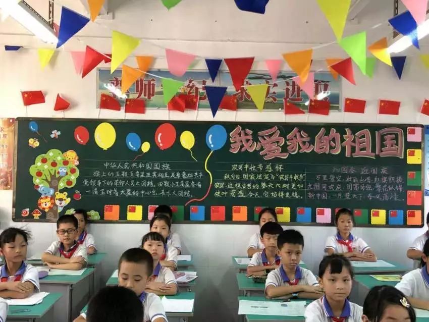 冯云小学各班以庆国庆为主题,通过描画黑板报、制作手抄报等形式把教室布置得多姿多彩,呈现出一派爱国情调。