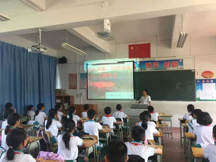 石狗学校各班举办“同升国旗,同唱国歌”主题班会,对学生进行爱国主义教育,加深学生对祖国的感情。
