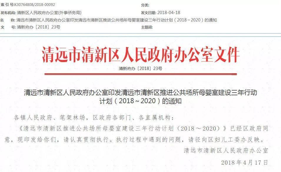 2018年4月中旬,清新区政府出台了《清新区推进公共场所母婴室建设三年行动计划(2018—2020年)》,并成立专项工作领导小组。