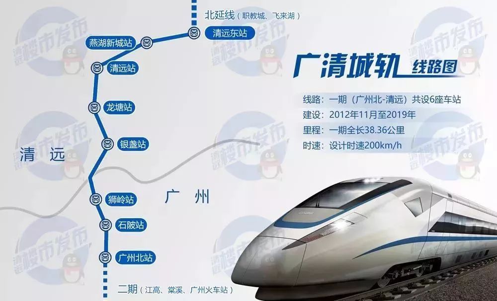 广清城轨首期广州北至清远段,全长38.36公里,途中设石陂、狮岭、银盏、龙塘站,设计时速为200km/h。工程于2012年年底开工建设,通车后从清远到广州花都只需25分钟。