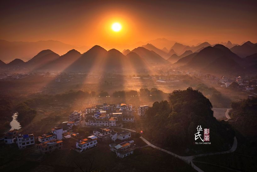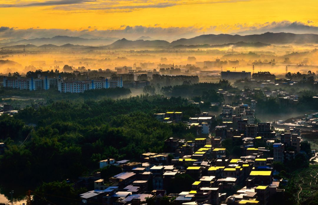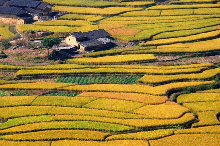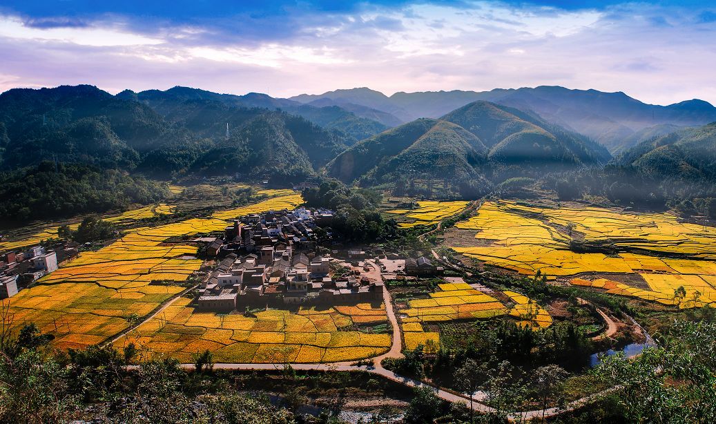 当成熟的水稻低下了头,用金黄的颜色铺满大地,与远处连绵的山丘相融,将零零星星的村庄包围。