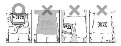 A. 选手凭号码布进入景区;号码布必须置于腹部前方,于任何时间均清晰可见(如下图)。