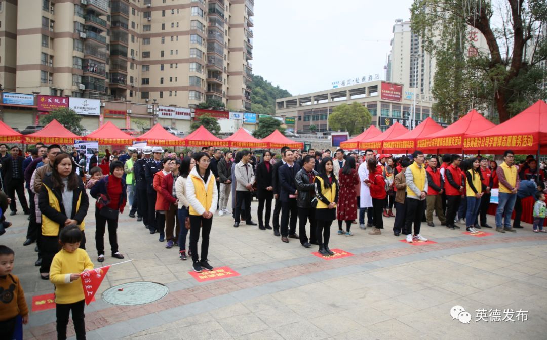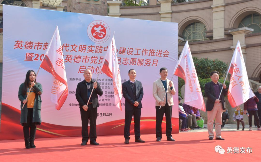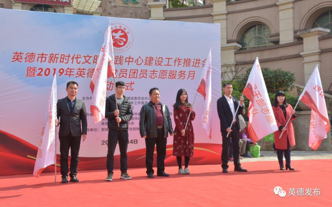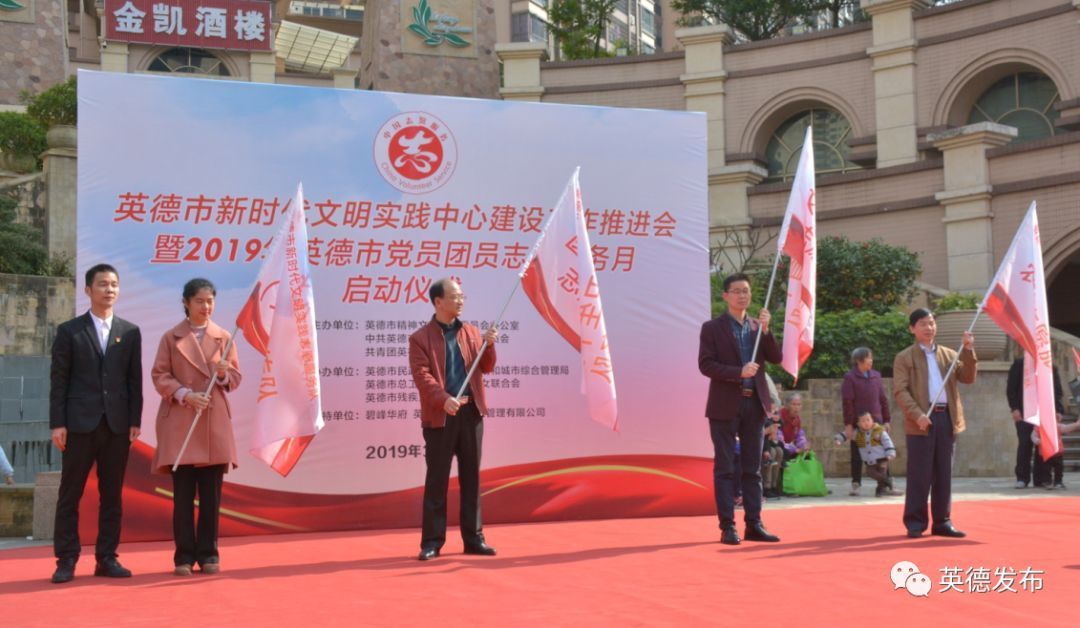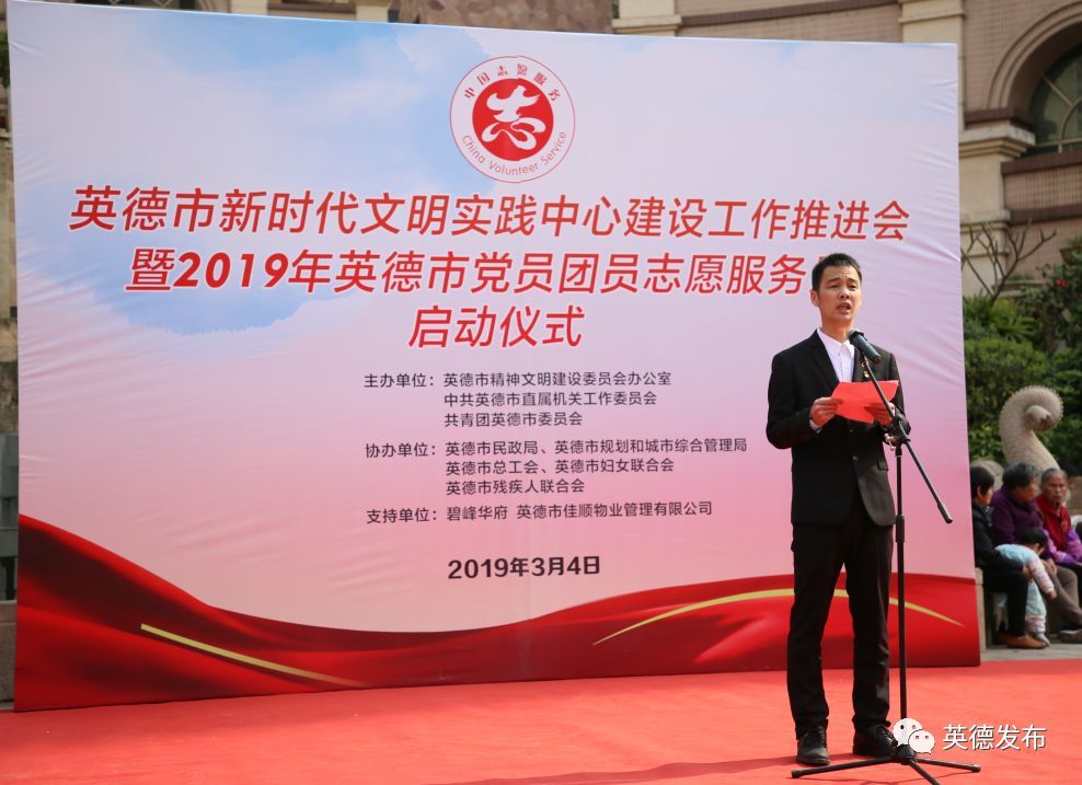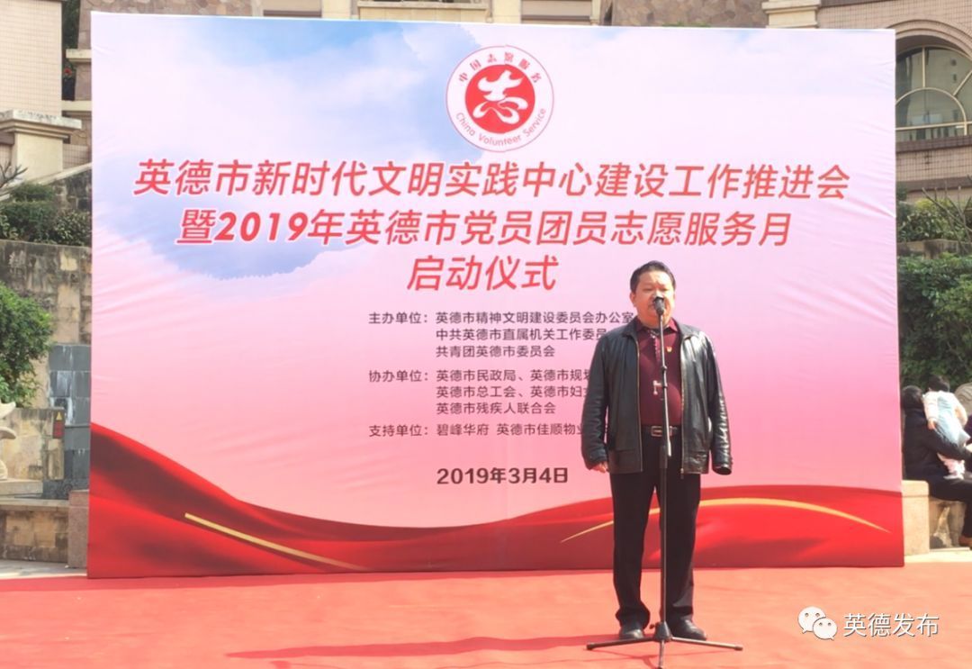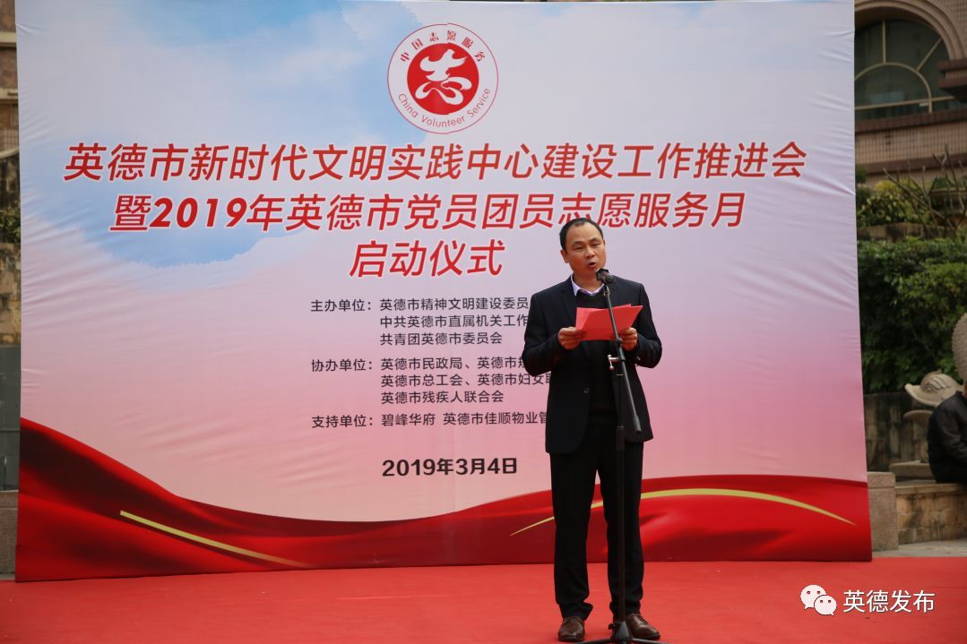 为弘扬““奉献、友爱、互助”的志愿精神,推进英德志愿服务制度化常态化,加快创建全国文明城市步伐,3月4日,市文明办、市直工委、团市委联合举办新时代文明实践中心建设工作推进会暨2019年英德市党员团员学雷锋志愿服务月活动启动仪式。市委宣传部副部长、市文明办主任梁振坚、市直工委书记朱志明、团市委副书记朱明智等领导嘉宾参加了活动。