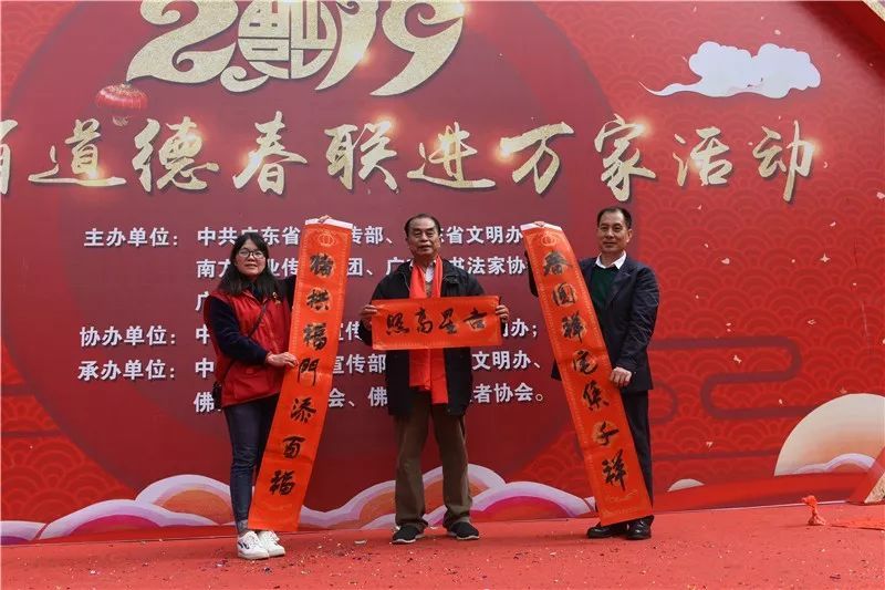 随后,省文明办副主任吴祖清、刘海斌,市文明办主任戚华海,县委书记董和平等省、市、县领导,以及省书法家协会、广东楹联学会的书法家代表向清远道德模范、佛冈道德模范、清远好人、佛冈好人等先进典型人物代表,赠送30对道德春联。
