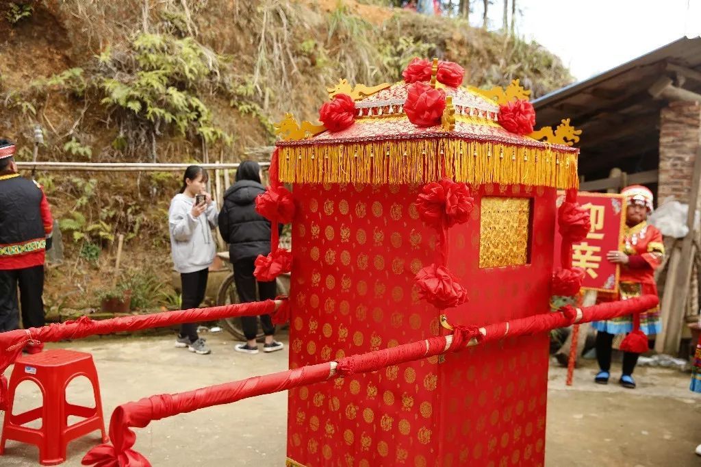 在婚礼当天,迎亲队伍一路敲锣打鼓,唢呐高奏。新娘由媒人牵着坐进花轿,花轿吸眼,彩礼夺目,许多宾客都围在两旁观看,热闹非凡!到了婚礼现场,村民们穿着美丽的民族服装、戴着精致的首饰与宾客们一起载歌载舞,宾客们纷纷表示,这场独特的瑶族婚礼让人耳目一新。