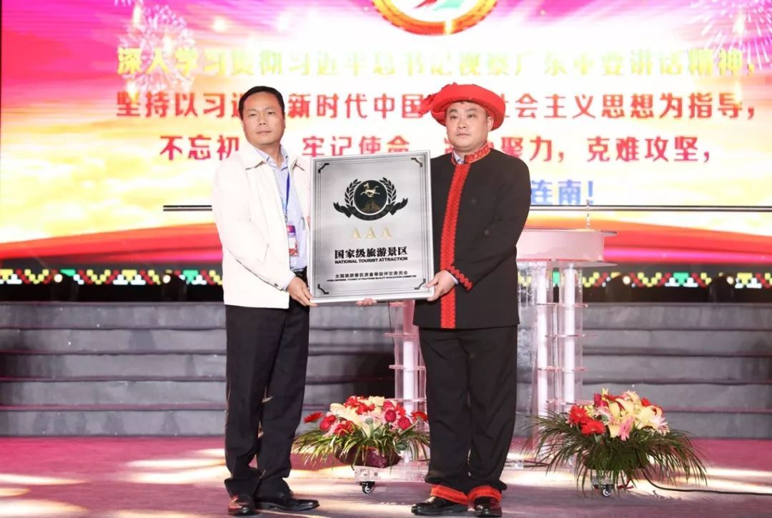 开幕式上首先举行授牌仪式,以世界首部瑶族风情实景音乐诗剧《瑶颂·瑶族舞曲》命名的连南“瑶颂·瑶族舞曲”实景演出景区被授予国家3A级旅游景区称号。
