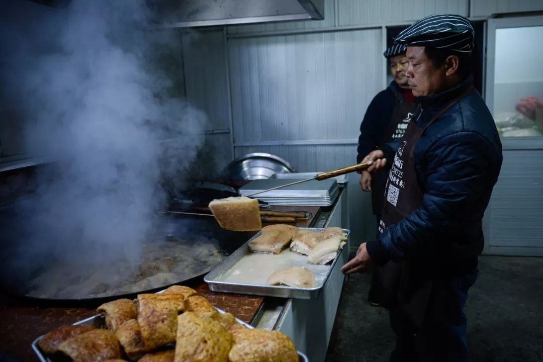 在口感方面,猫哥派出采购员到本地肉类市场和农场直接采购猪肉,凭借多年积累的经验,用看和摸来确保肉质。精选回来的五花肉切块,下锅炸煮至“起龟皮”,呈现金黄色泽,而这只是繁琐工序中的一环。一碗地道的星子扣肉,必须经过九道工序,全程手工制作,出品肥而不腻,皮脆肉爽。