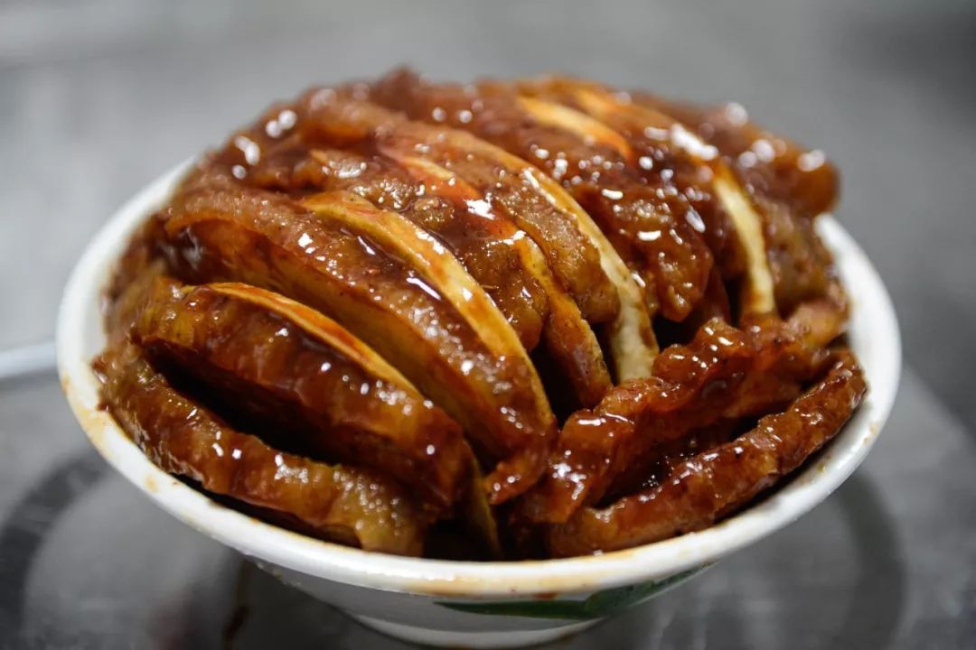 最后取一碟子盖在碗上,将蒸好的内反“扣”在碟内,让红色的肉皮向外,一碟色、香、味俱全的星子扣肉便可上席了。