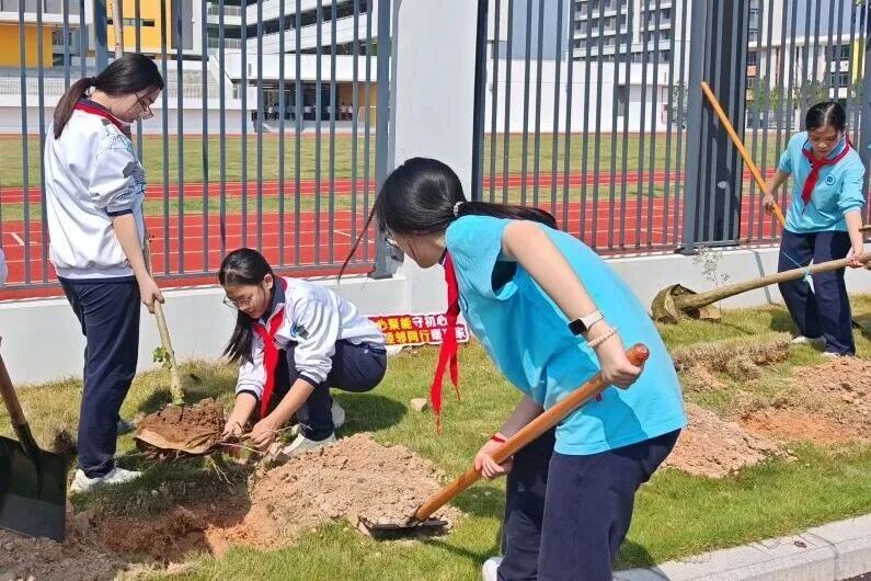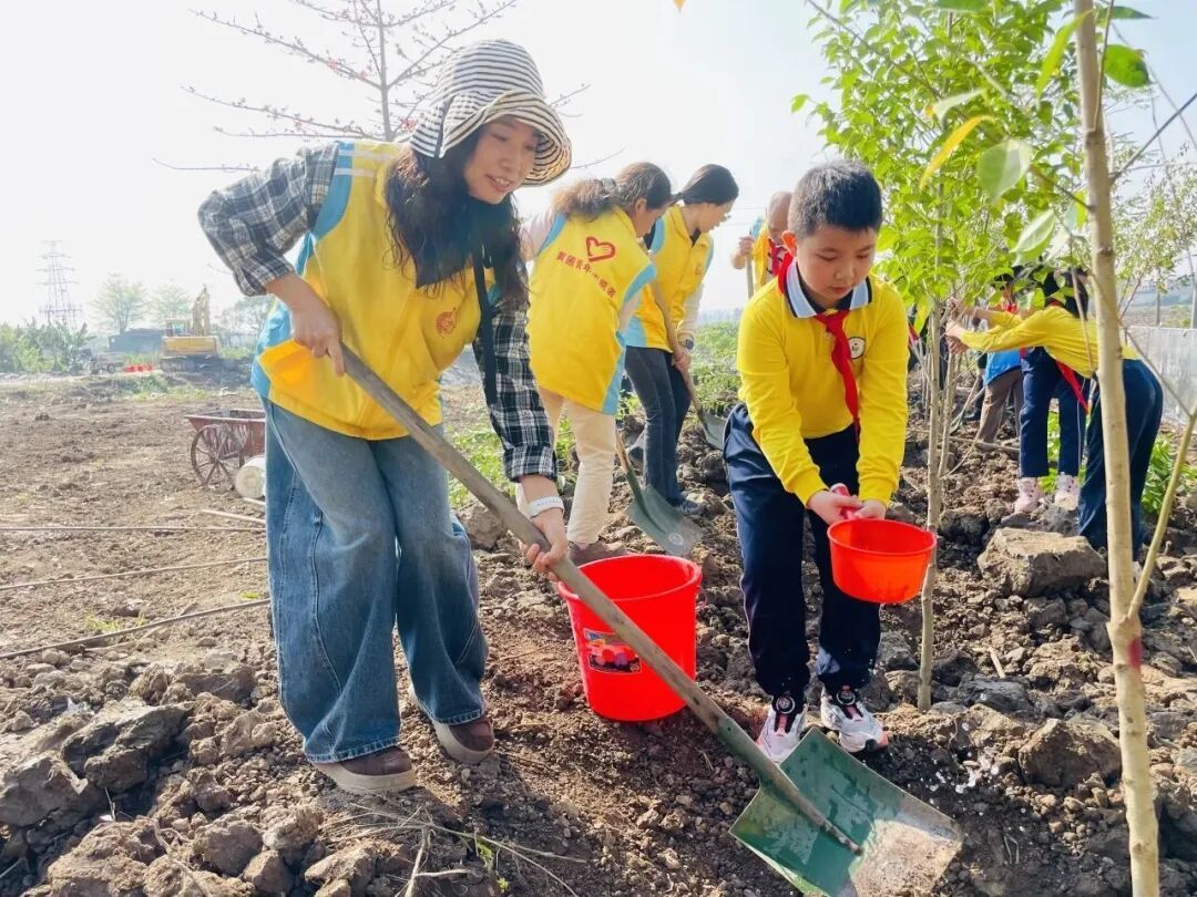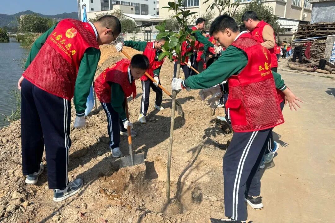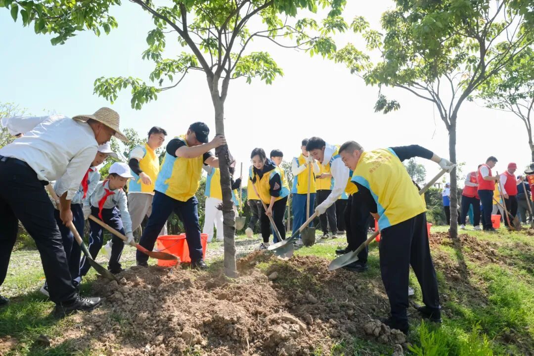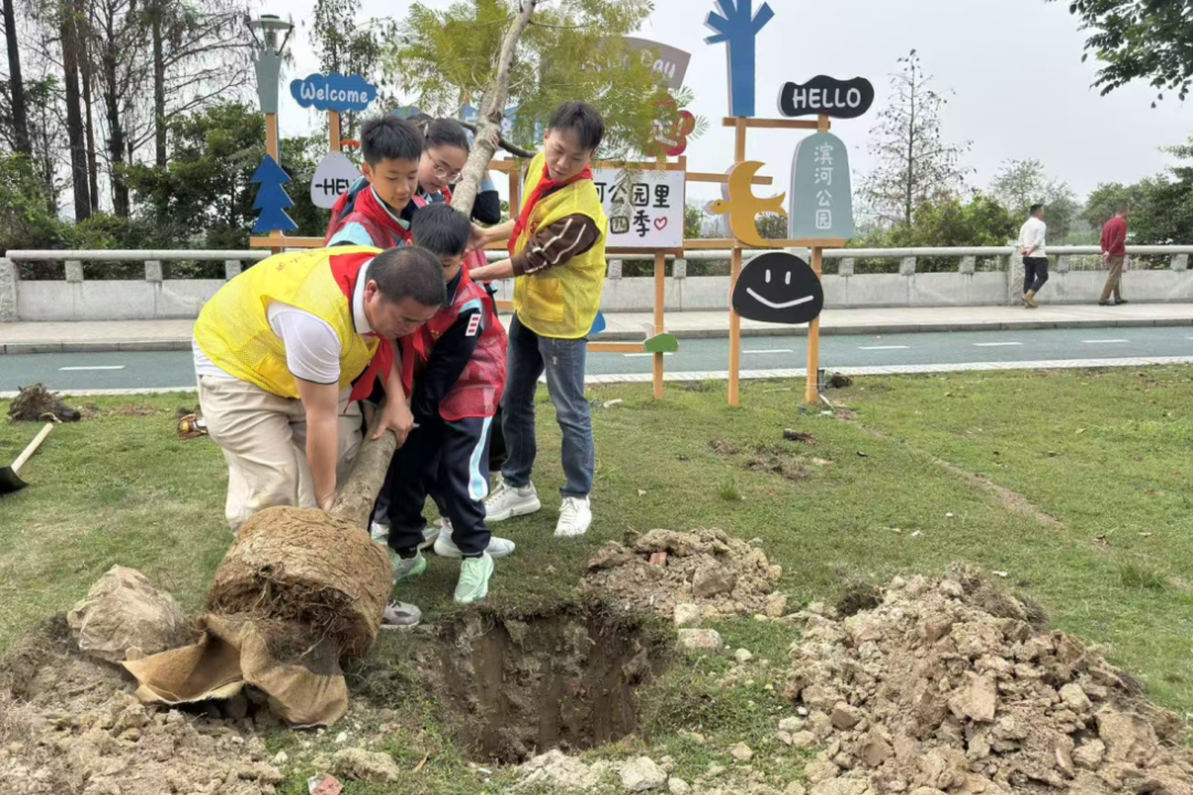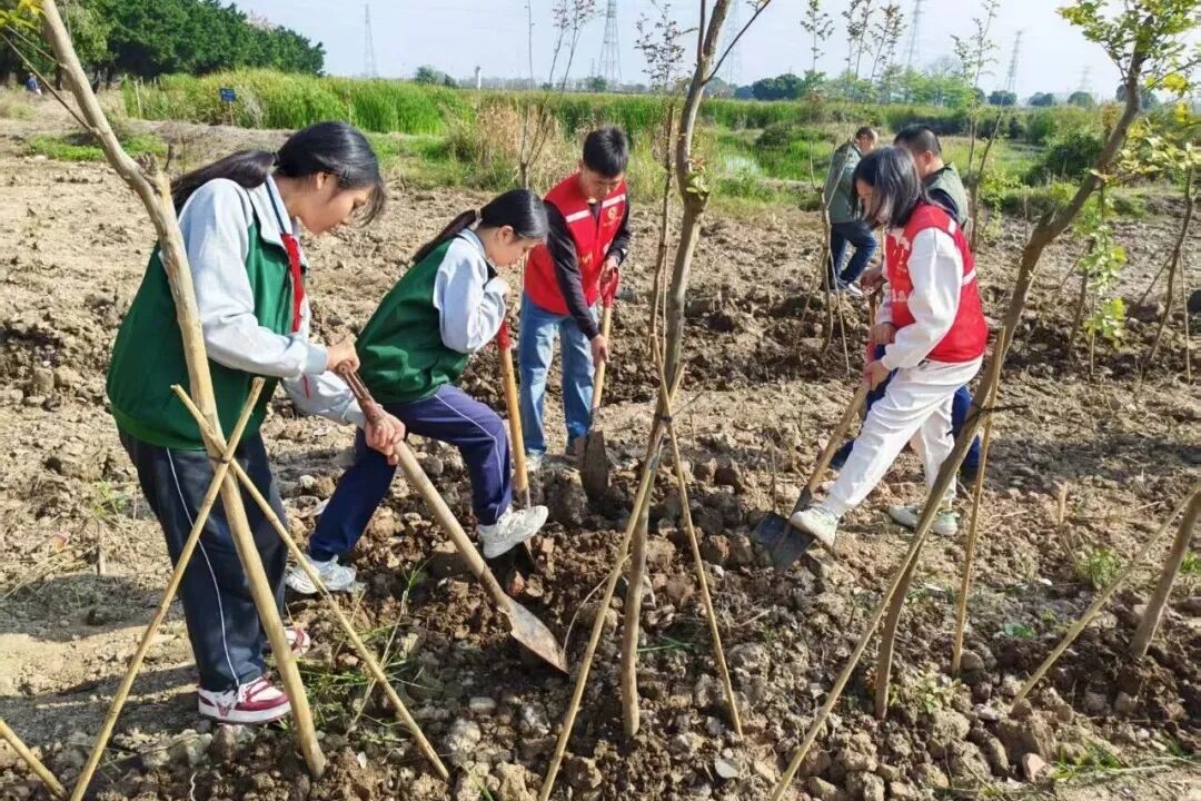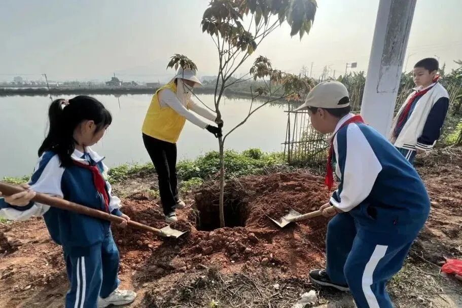 南朗街道团工委联合多单位在兰溪河畔、翠雅学校开展“绿美广东 青年先行”植树活动,组织青年志愿者及少先队员种植树苗140棵,开展分龄层实践,家校社联动传承家国情怀。