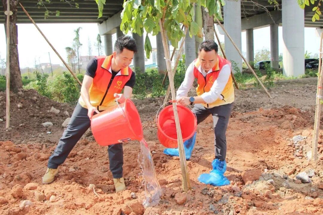 植树现场秩序井然、氛围热烈,全体参与人员化身绿美志愿者,分工协作、默契配合,扶苗、培土、浇水、定根,沿河涌两岸连片栽种绿林,精心打造“绿美青年林”,用一锹一土、一树一苗筑牢河岸生态屏障。