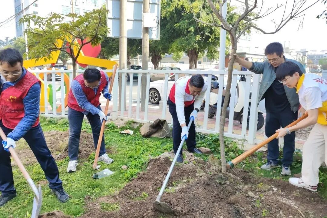 西区街道联动隆昌、广丰、沙朗等社区同步开展植树活动。党员干部带领群众约130人,分工协作种植桃花、紫花风铃木等260株,为渔乡生态与社区环境增添新绿,凝聚起党群共建绿美家园的合力。