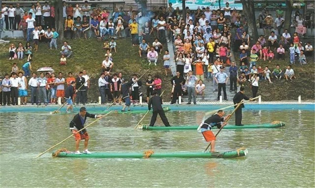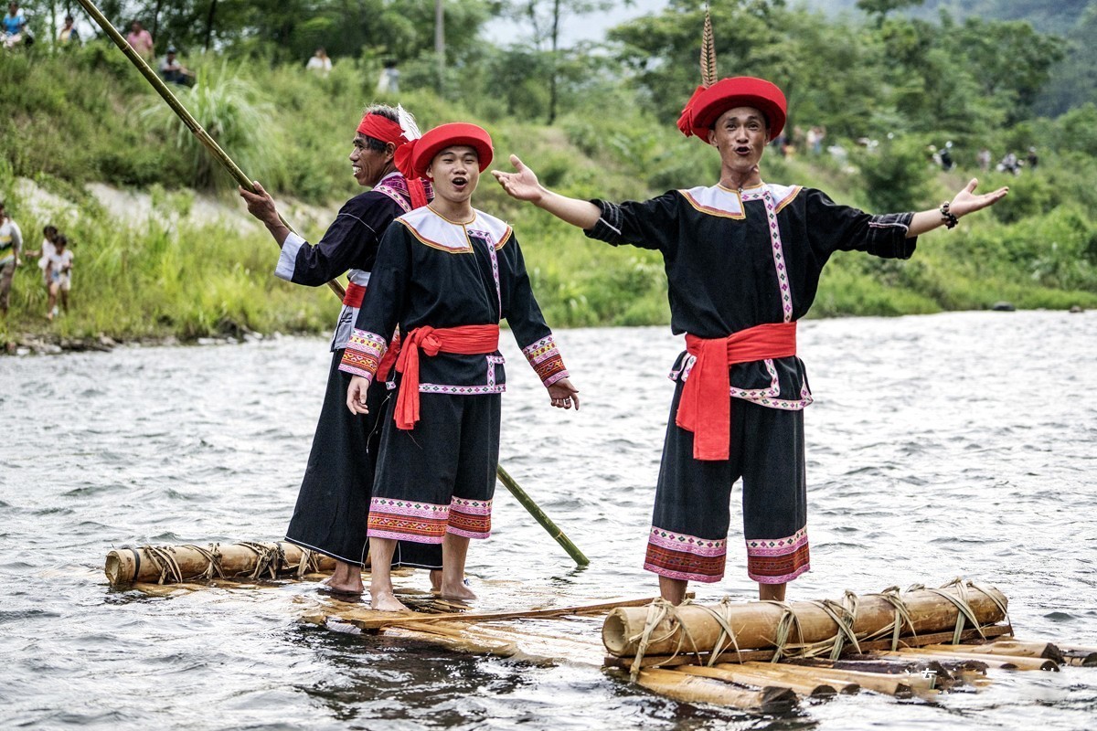 下午时段,竹排竞速比赛以队为单位展开了紧张刺激的较量。清澈见底的河水上竹排速速前行,数只竹排在河面上你追我赶,水面激起层层浪花。