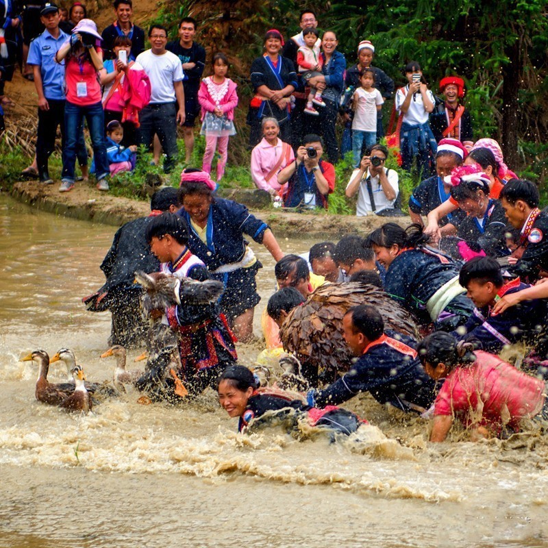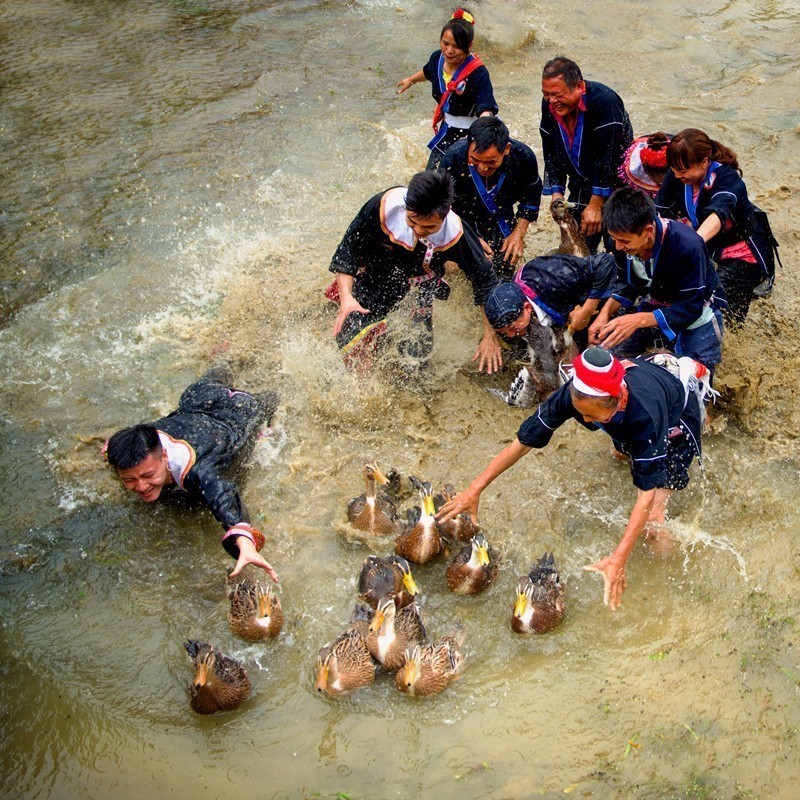 欢乐的抓鱼比赛还未停下,这旁的捉鸭子比赛同样开展得热火朝天!游客们有的被鸭子扑腾地溅了一身泥,有的为了抓住“猎物”英勇倒地,一时间,整个田间充满了欢声笑语。