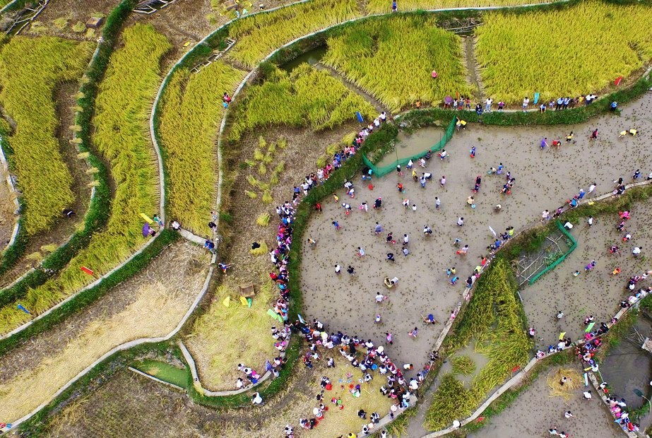 稻田外的田基上也充满了围观打气的群众,缤纷的抓鱼大战一触即发,众人纵享捕抓的乐趣!