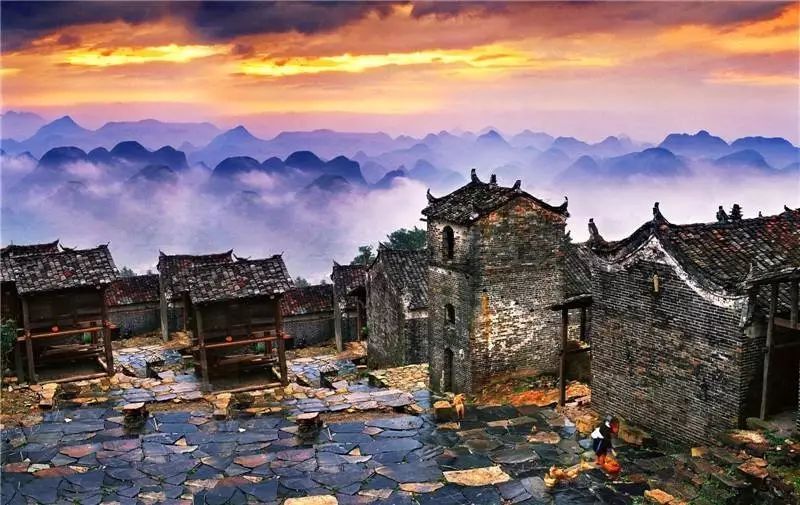 古寨依山而建,房屋层叠,错落有致;石板道纵横交错,主次分明;周围山势险要,溪水奔流,群峰迭嶂。