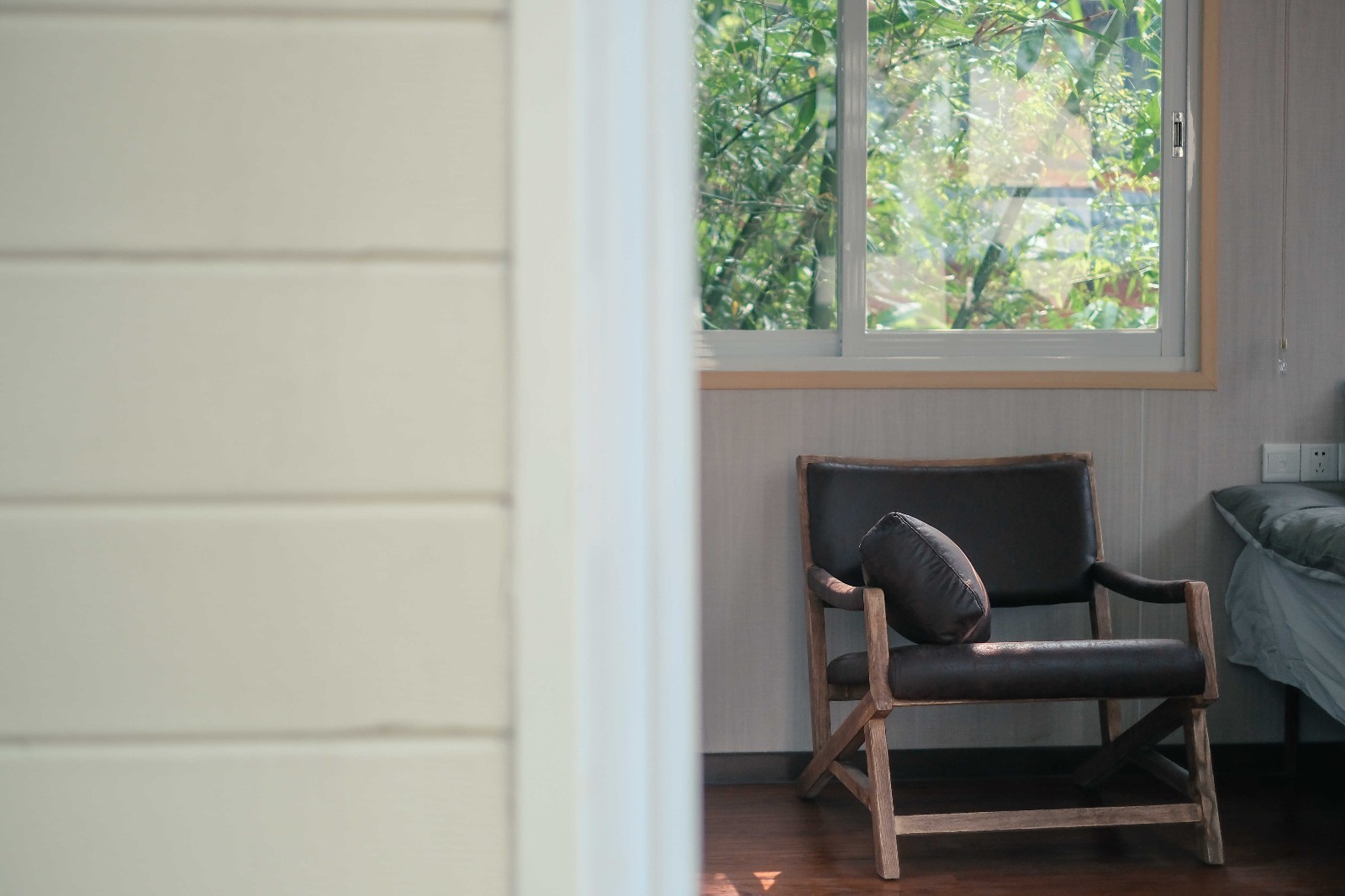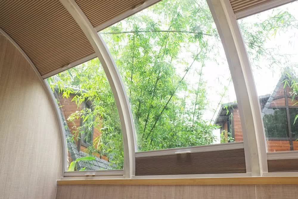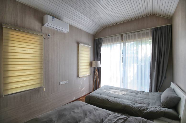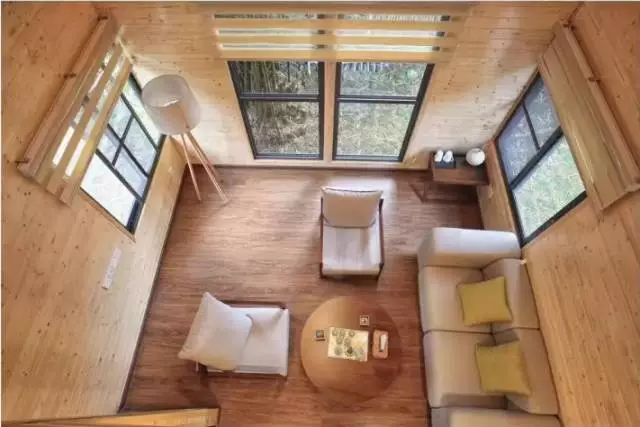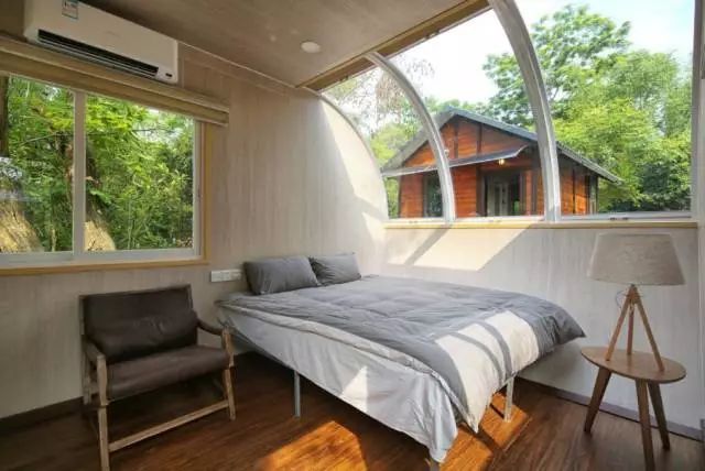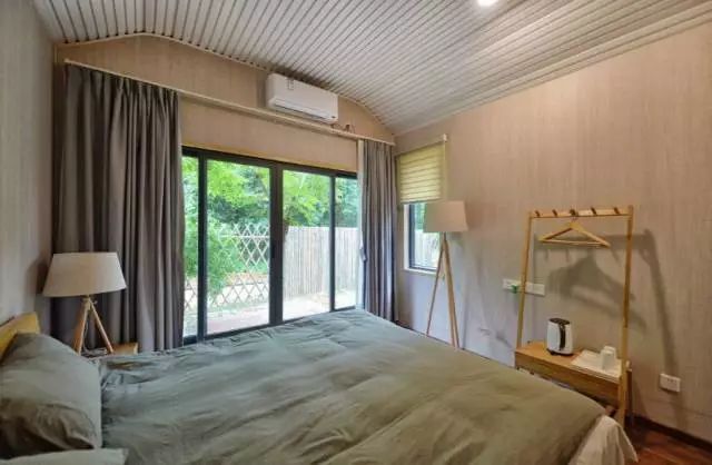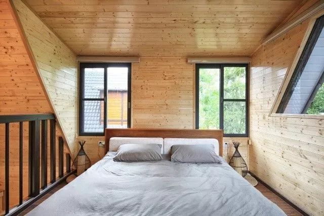 走上二层,这里便是一个舒适无比的阁楼卧室。虽然,这里并没有像全景太空舱一般采用全景玻璃,但透过房间四周的窗户,你也能看到竹林绿意,同样是美不胜收!