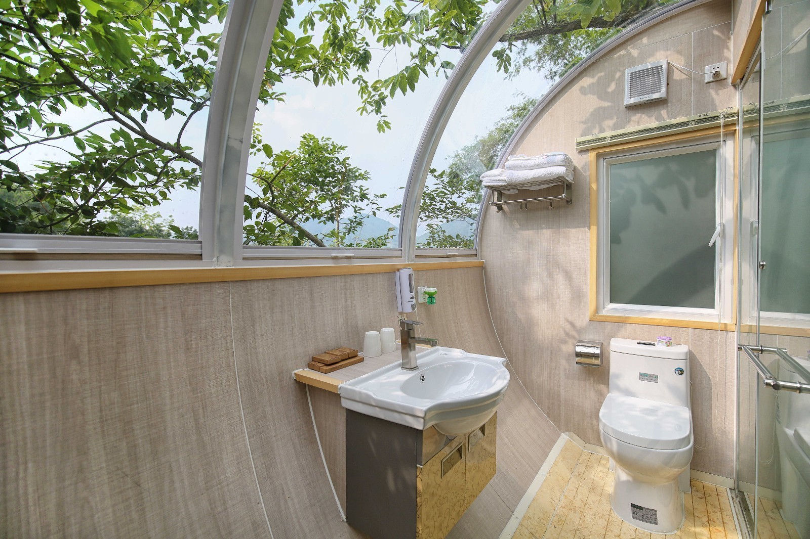 走到房间,不论是井然的室内装潢,还是别出心裁的全景玻璃窗,甚至是干净整洁的洗手间,都极为讨喜,让人恨不得马上下榻体验一番。