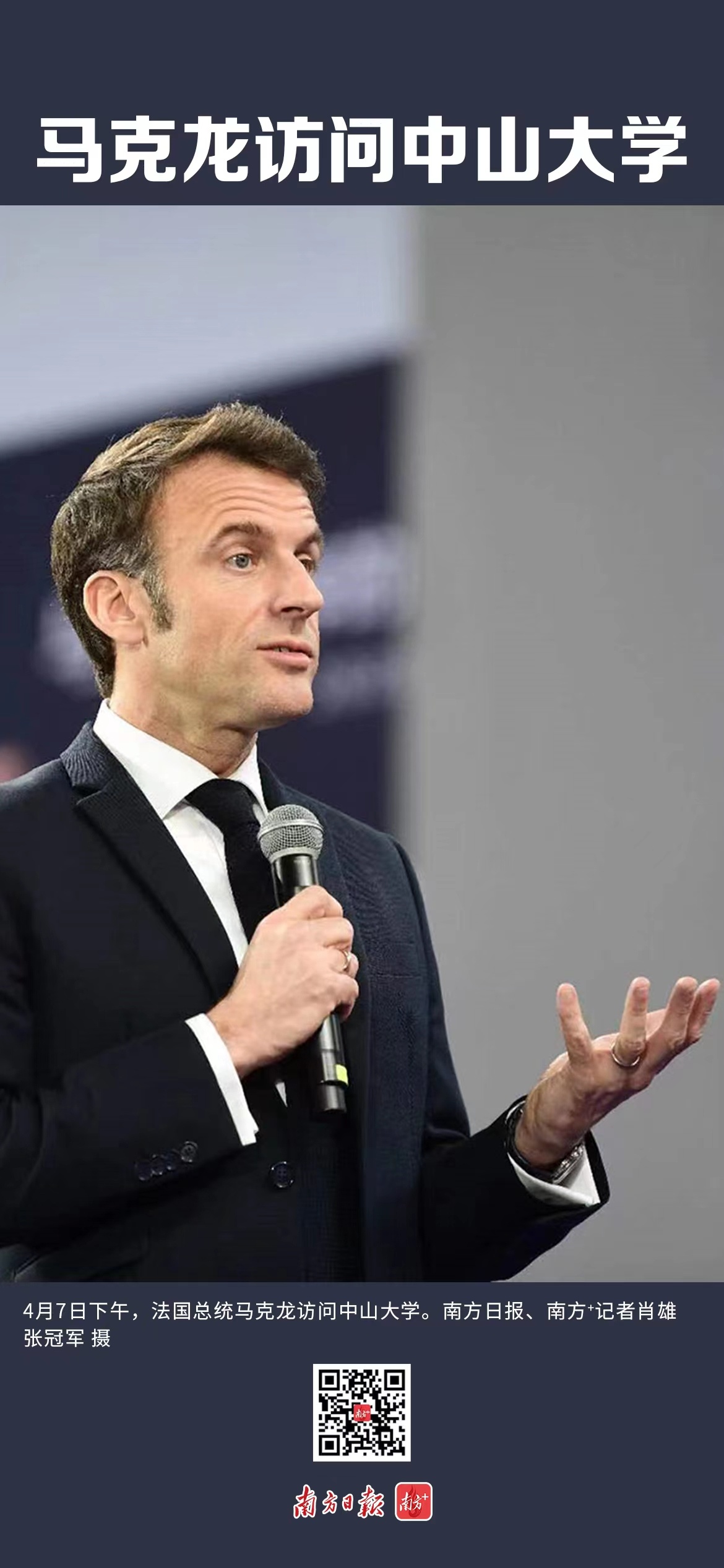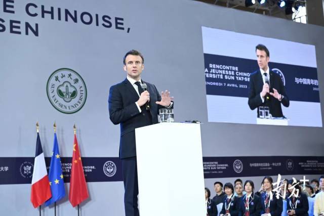 4月7日,在对中国进行国事访问期间,法国总统马克龙来到中山大学参观访问,与学生交流互动。